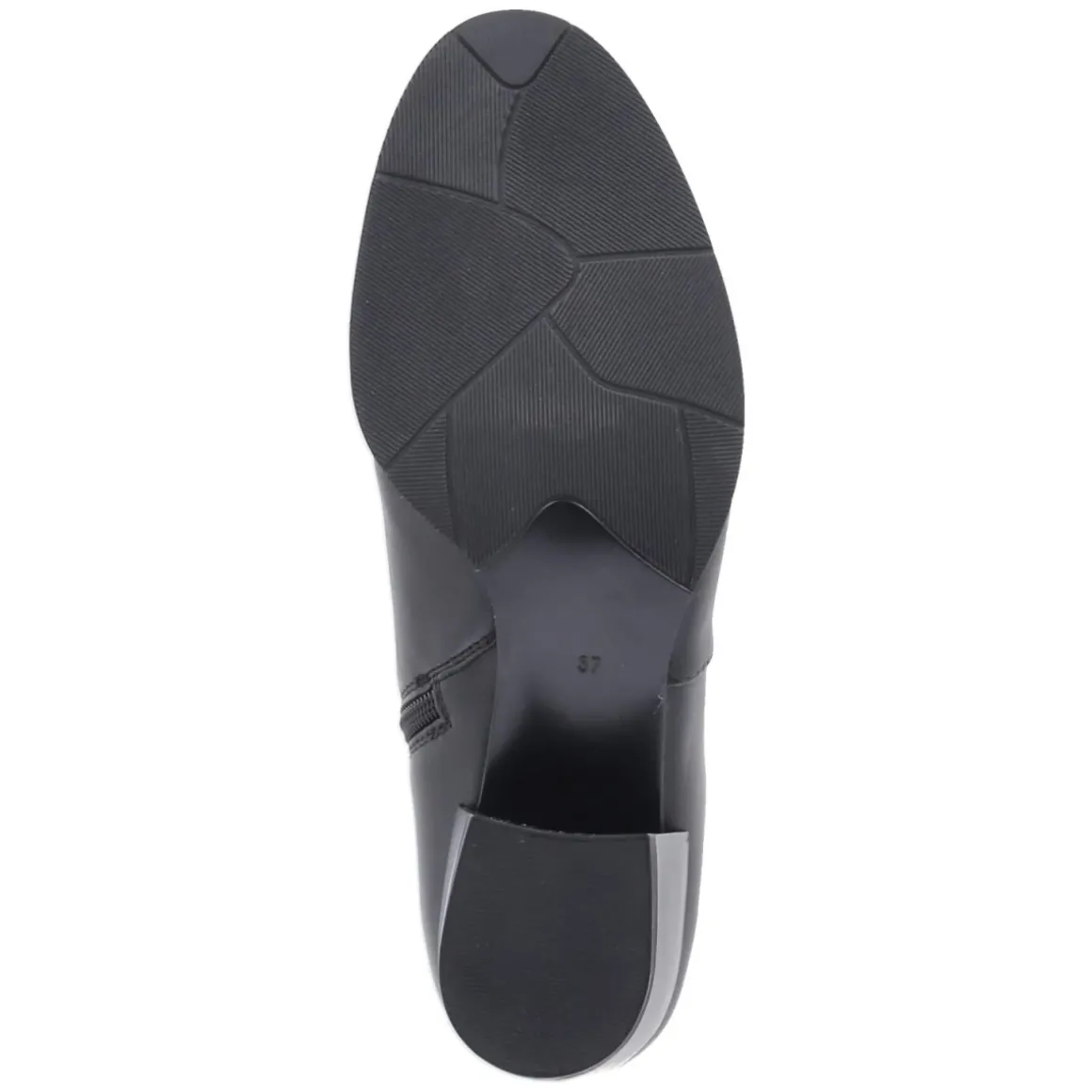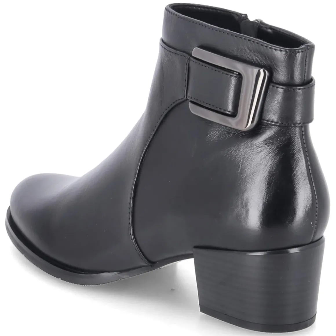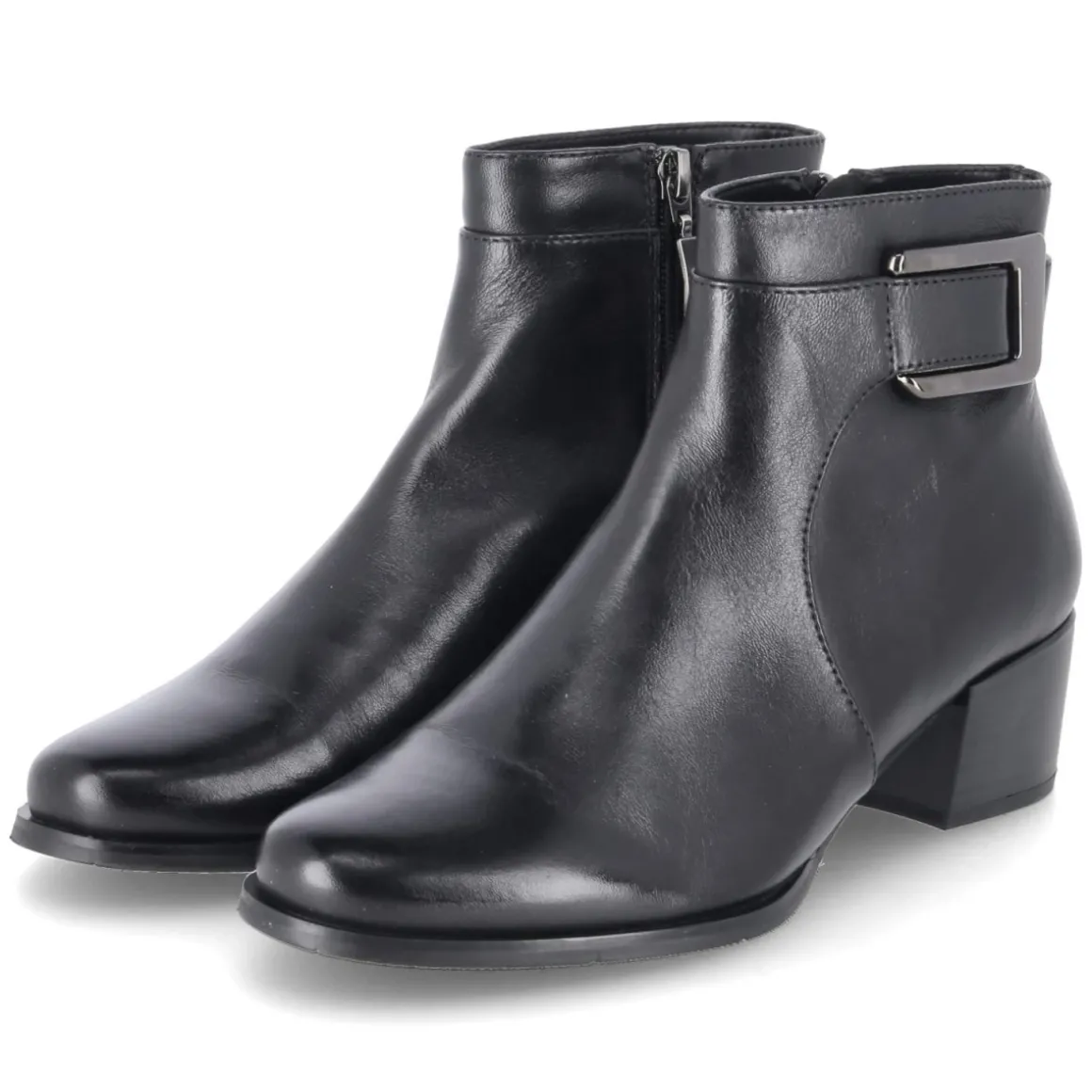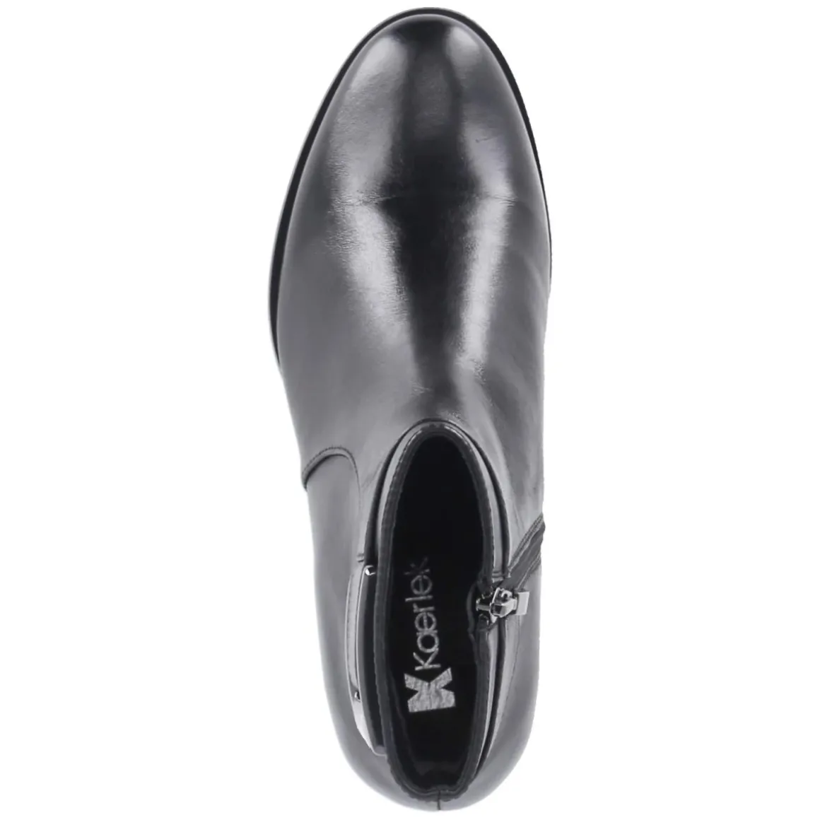 Der Ankle Boot von Kaerlek setzt auf zeitlose Eleganz und zuverlässigen Komfort. Feines Glattleder in tiefem Schwarz, eine runde Vorderkappe und der stabile Blockabsatz in Holzoptik (5 cm) formen eine feminine Silhouette, die sowohl im Büro als auch am Abend überzeugt. Das leichte Fleecefutter hält an kühleren Tagen angenehm warm, während das komfortable Wechselfußbett in Kombination mit der textilen Decksohle für ein weiches Tragegefühl sorgt. Ein seitlicher Reißverschluss ermöglicht einen schnellen Einstieg, die Zierschnalle in Titanoptik am Knöchel verleiht einen edlen Akzent. Die Passform fällt größengetreu aus und unterstützt einen sicheren Auftritt. Modetipp: Mit cropped Straight-Jeans und strukturiertem Wollmantel entsteht ein moderner City-Look, alternativ ergänzt ein Midirock mit blickdichten Strümpfen eine elegante, herbstliche Note.