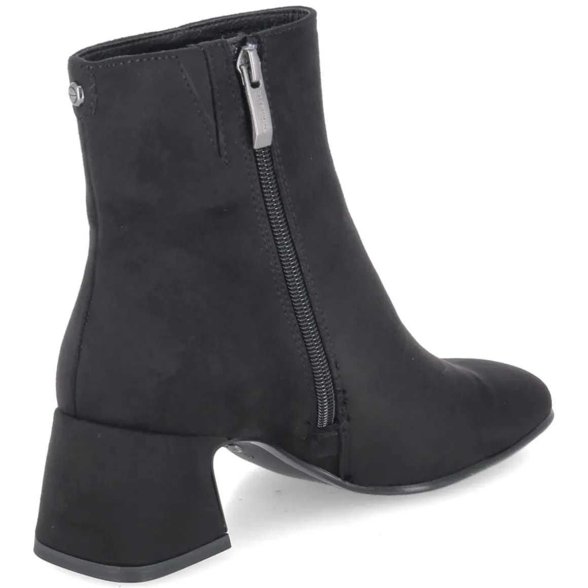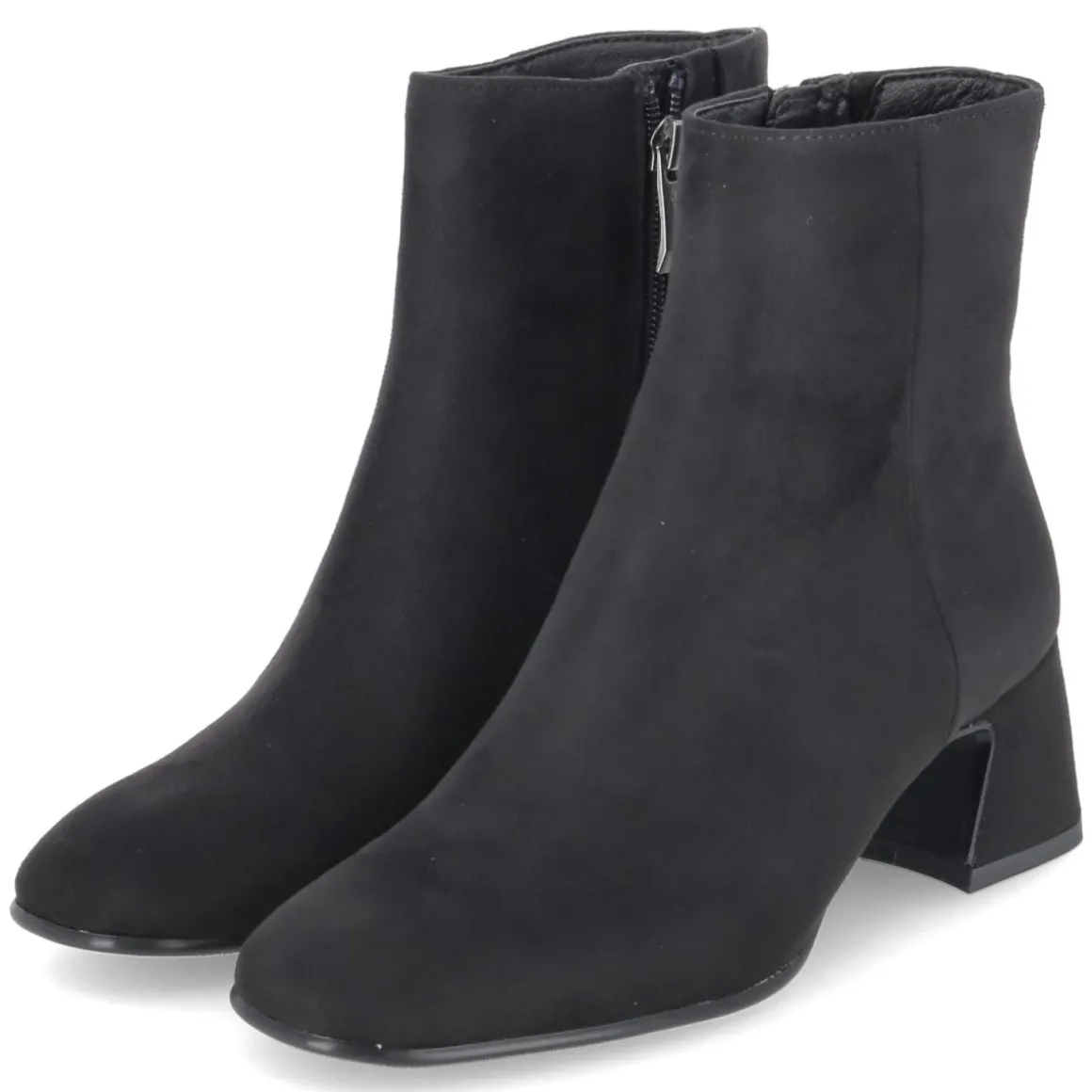 Tamaris präsentiert Ankle Boots in klassischem Schwarz mit rundem Leisten und 6 cm hohem Blockabsatz für souveränen Stand im Alltag und abends. Das textile Obermaterial zeigt eine samtige Oberfläche, der seitliche Reißverschluss mit kleinem Elastikeinsatz am Schaft erleichtert den Einstieg und sorgt für Komfort in Bewegung. Innen punktet eine textile Decksohle, das gepolsterte Fußbett federt Schritte weich ab, während die flexible Laufsohle zuverlässigen Grip bietet. Das vegane Materialkonzept überzeugt ebenso wie das zeitlose Design, das mühelos Business- und Casual-Looks begleitet. Der Schnitt fällt normal aus und richtet sich an erwachsene Trägerinnen. Modetipp: Besonders elegant wirkt das Modell zu Midikleid aus Satinstoff und Oversize-Blazer, dazu eine strukturierte Schultertasche für einen modernen City-Look.