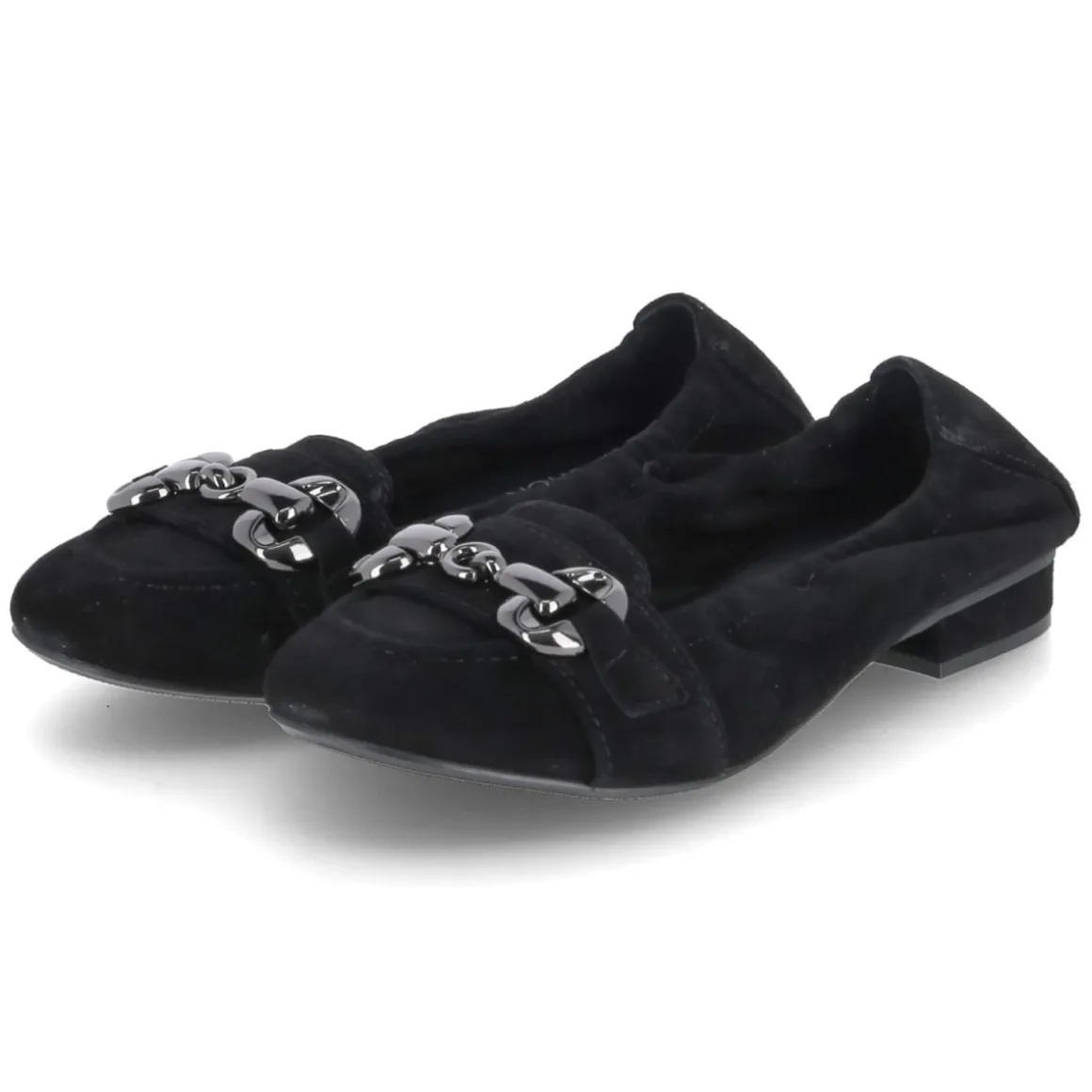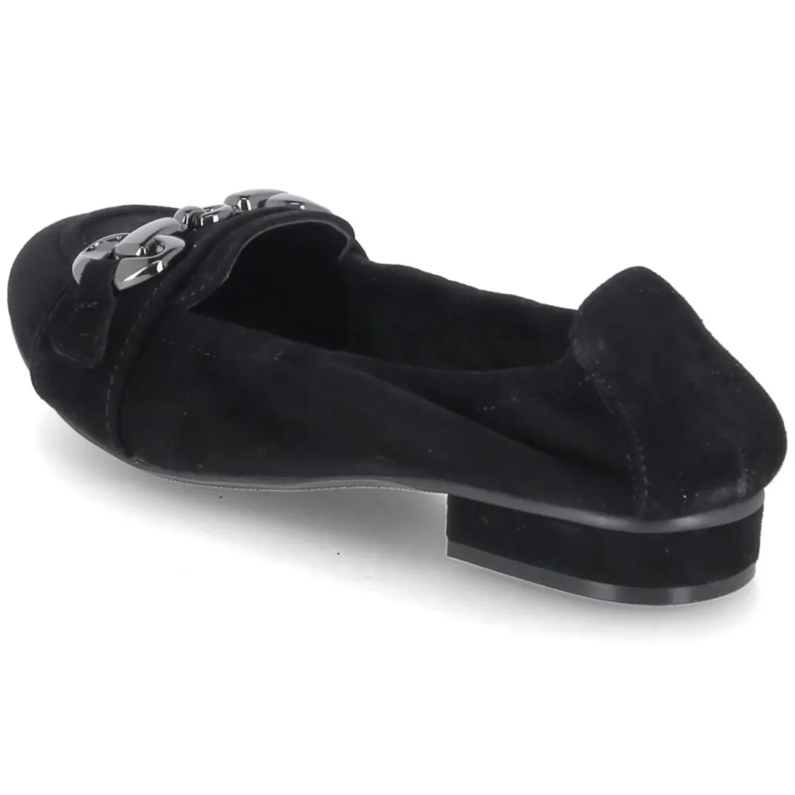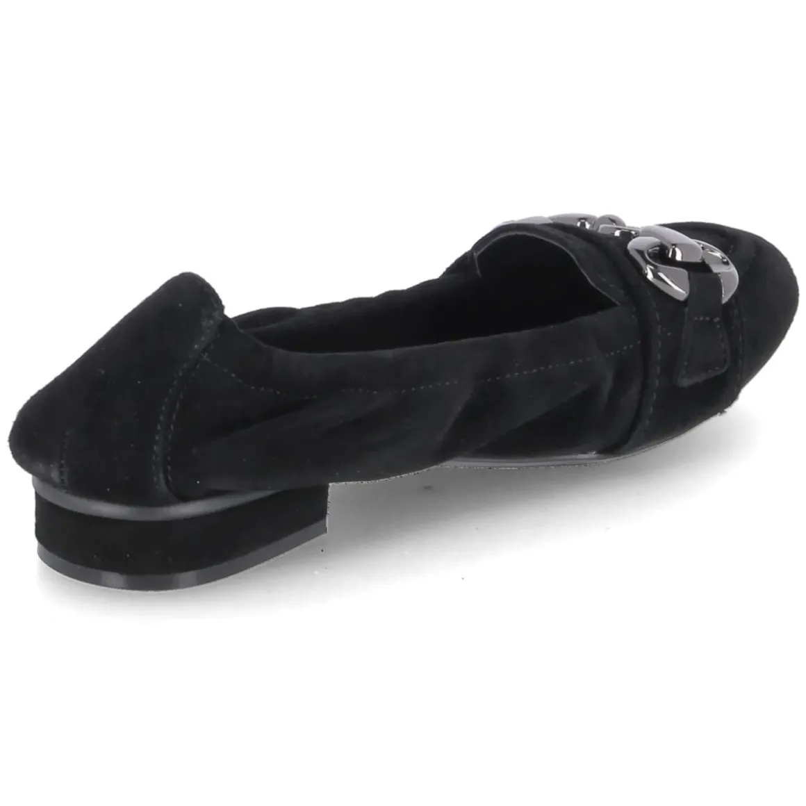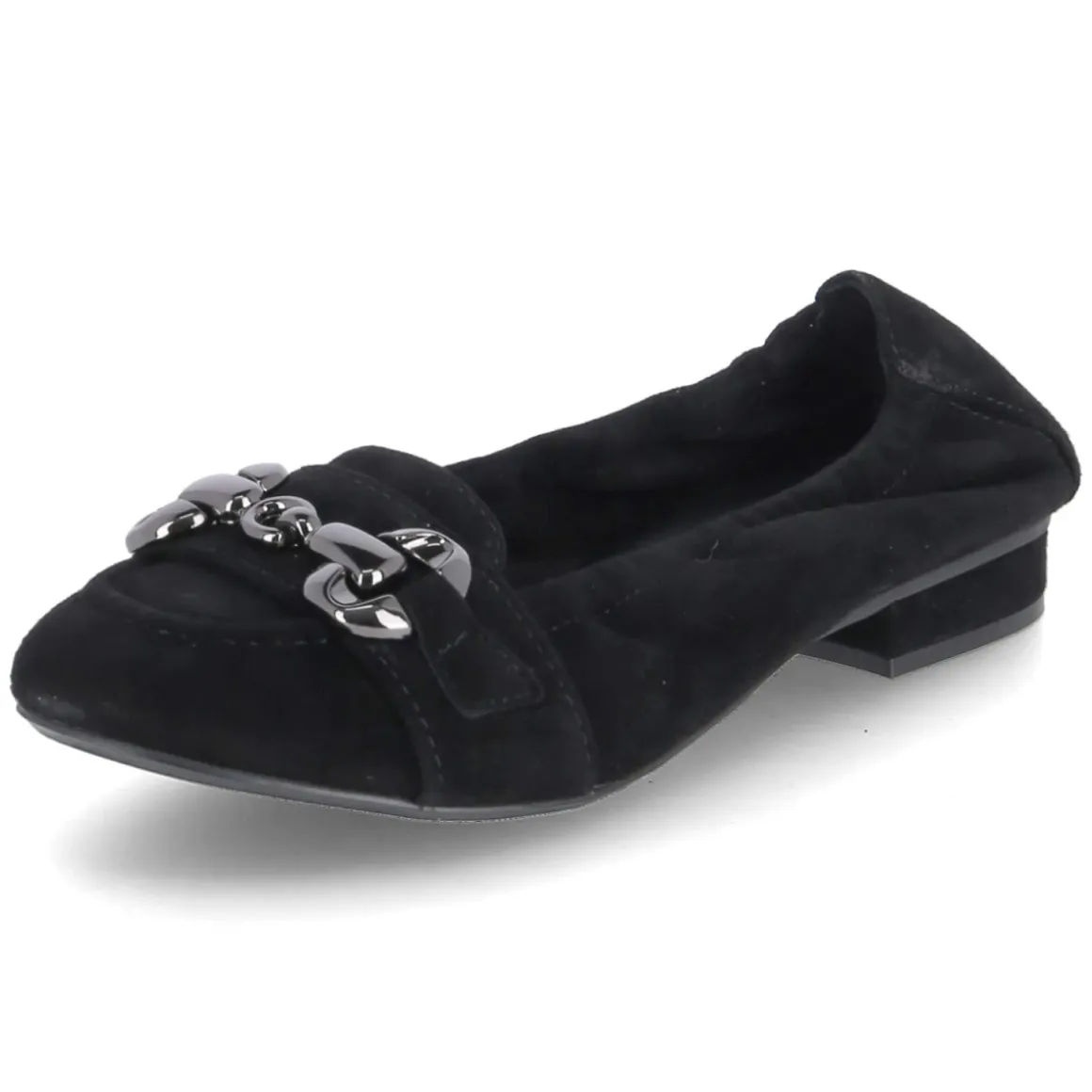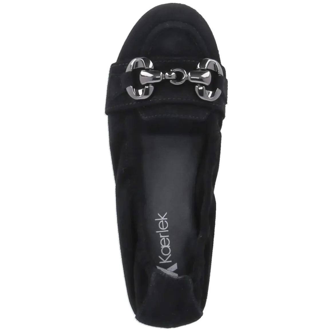 Der Ballerina von Kaerlek in klassischem Schwarz verbindet feminine Linien mit wohldurchdachten Komfortdetails. Weiches Rauleder und langlebiges Echtleder treffen auf eine gepolsterte Decksohle aus Leder, die den Fuß angenehm unterstützt. Der elastische Einstieg umschließt sanft den Spann und erleichtert das Hineinschlüpfen, während der kleine Zierriemen mit Metallelement in Titanoptik und die angedeutete Zunge dem puristischen Design eine edle Note geben. Die runde Schuhspitze wirkt zeitlos, die verstärkte Ferse sorgt für Formstabilität. Mit 2 cm hohem Blockabsatz und sehr flexibler, rutschhemmender Laufsohle bietet das Modell zuverlässigen Halt im Alltag. Fällt normal aus und kommt ganz ohne Verschluss aus – ideal für schnelle Looks zwischen Büro und Freizeit. Modetipp: Zu knöchellangen Zigarettenhosen und einem strukturierten Blazer entsteht ein moderner, reduzierter City-Chic, der die subtile Metall-Details elegant aufgreift.
