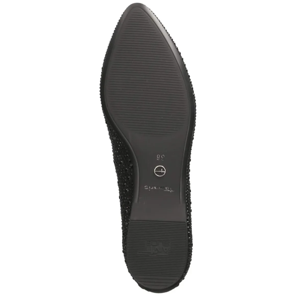 Diese schwarzen Tamaris Ballerinas verbinden festliches Design mit komfortabler Ausstattung. Die spitze Silhouette streckt optisch den Fuß, während die markante Zierschnalle mit schwarzen Schmucksteinen subtile Brillanz verleiht. Obermaterial aus Textil und eine Decksohle aus Textil & Synthetik sorgen für ein angenehmes Tragegefühl. Der klassische Magnetverschluss mit kleinem Elastikeinsatz erleichtert den Einstieg und hält sicher am Fuß. Ein weich gepolstertes Fußbett und die flexible, rutschfeste Laufsohle bieten verlässliche Bequemlichkeit – ideal für lange Abende. Das Modell fällt normal aus und eignet sich als elegante Alternative zu Pumps. Modetipp: Zu satiniertem Midirock und kurzem Blazer entsteht ein moderner Abendlook; alltagstauglich mit knöchellanger Zigarettenhose und feinem Strick top.