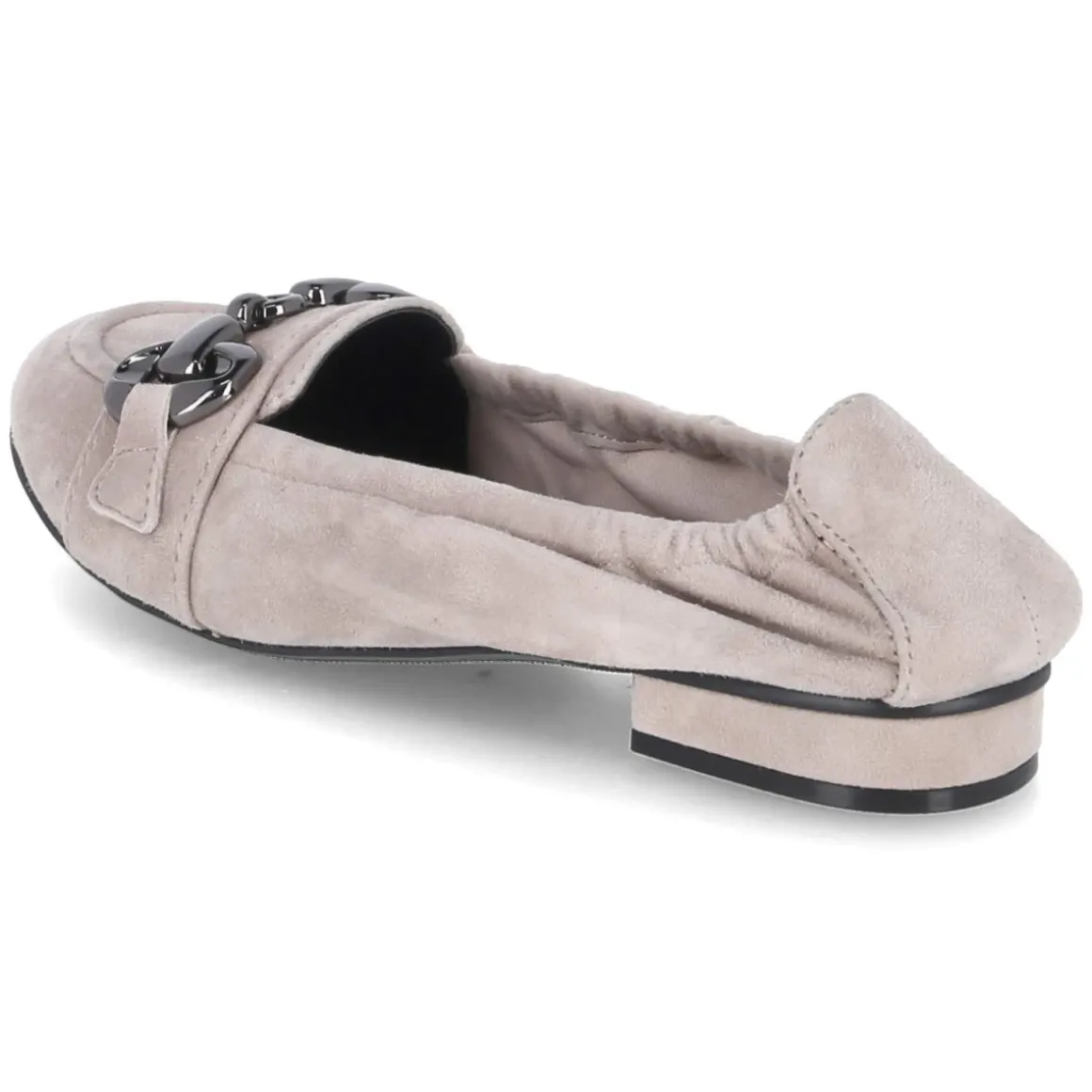 Die Ballerinas von Kaerlek verbinden subtile Raffinesse mit hohem Tragekomfort. Weiches Rauleder in sanftem Beige und eine runde Spitze sorgen für eine edle, zeitlose Anmutung. Das langlebige Echtleder wird von einer gepolsterten Lederdecksohle ergänzt, die zusammen mit dem elastischen Einstieg und der verstärkten Ferse sicheren Halt bietet. Ein 2 cm hoher Blockabsatz und die sehr flexible, rutschhemmende Laufsohle machen das Modell alltagstauglich – vom Office bis zum Dinner. Charakteristisches Detail ist die kleine Zunge mit Zierriemen und Metallelement in glänzender Titanoptik, die den Stil modern abrundet. Ohne Verschluss, fällt normal aus und schmiegt sich angenehm an den Fuß. Modetipp: zu verkürzten Zigarettenhosen und einem feinen Stricktop kombinieren; ein Trenchcoat in Sandtönen komplettiert den eleganten Look.