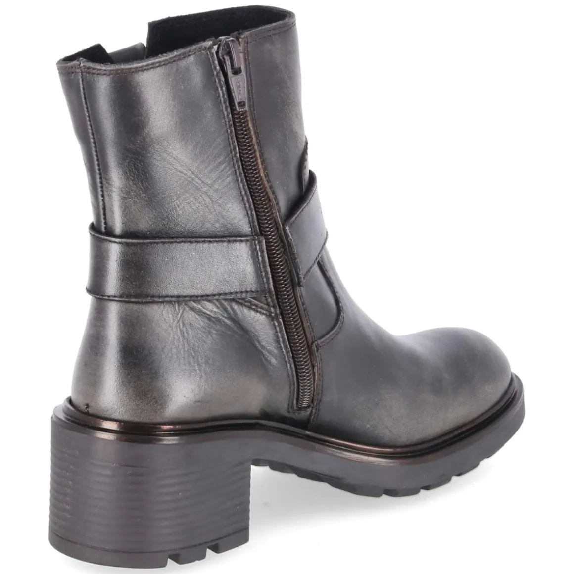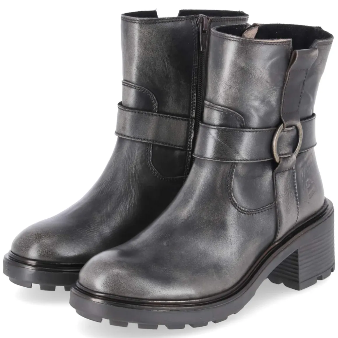 Bullboxer interpretiert den klassischen Biker-Look mit robusten Boots aus langlebigem Glattleder in Braun, das je nach Licht dezent grau wirken kann. Die markante Ringschnalle am Schaft betont die kraftvolle Silhouette, während die rutschfeste Profilsohle und der 6 cm hohe Blockabsatz sicheren Stand auf urbanem Terrain bieten. Ein gepolstertes Fußbett und eine synthetische Decksohle sorgen für Komfort im Alltag. Der schmale Schnitt und die runde Kappe verleihen dem Modell eine feminine Linie, der seitliche Reißverschluss ermöglicht einen bequemen Einstieg. Die solide Verarbeitung und die kräftige Sohle machen die Stiefelette zum beständigen Begleiter von Früh bis Spät. Modetipp: Für einen stilvollen Kontrast zu der derben Form eignen sich fließende Midikleider und Feinstrick, ergänzt um eine Lederjacke in Ton-in-Ton-Optik.