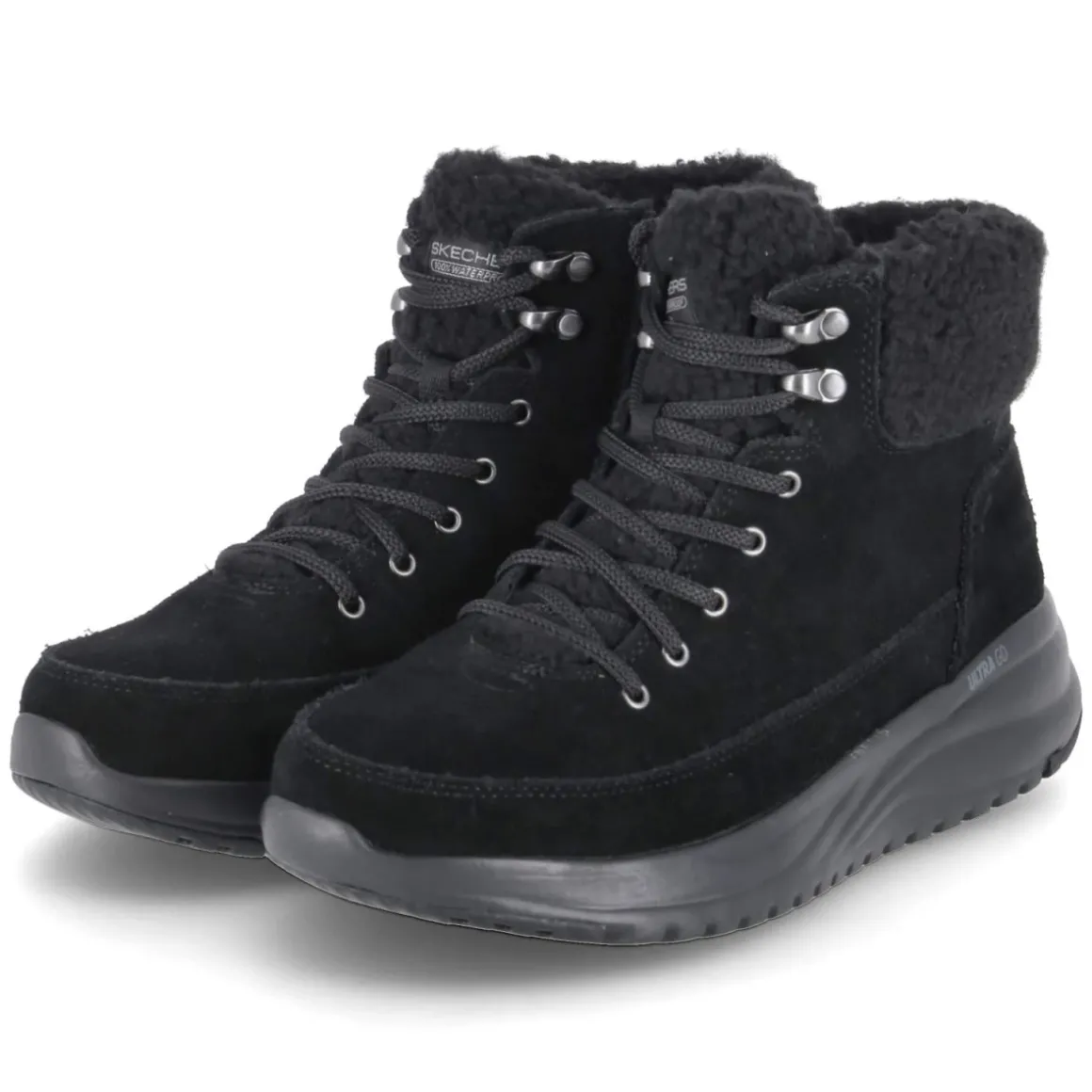 Skechers ON THE GO STELLAR vereint wintertaugliche Funktion mit sportlichem Look. Das schwarze Rauleder zeigt sich robust und zugleich angenehm weich, die wasserfest verarbeitete und atmungsaktive Konstruktion hält zuverlässig trocken. Warmfutter mit kuscheligem Teddykragen umschließt den Knöchel, während das weiche Fleecefutter bis in die Spitze wärmt. Schnürung sorgt für präzisen Halt, der zusätzliche Reißverschluss ermöglicht einen schnellen Einstieg. Ein verstärkter Fußrahmen stabilisiert, das gepolsterte Memory Foam Fußbett federt jeden Schritt ab. Die rutschhemmende Profilsohle greift sicher auf nassem Asphalt und winterlichen Wegen. Runde Schuhspitze und normal ausfallende Passform bieten angenehme Zehenfreiheit; die Decksohle aus Textil punktet mit Komfort im Alltag. Modetipp: Mit Pufferjacke, Thermo-Leggings und grob gestrickter Beanie entsteht ein urbaner Winter-Look.