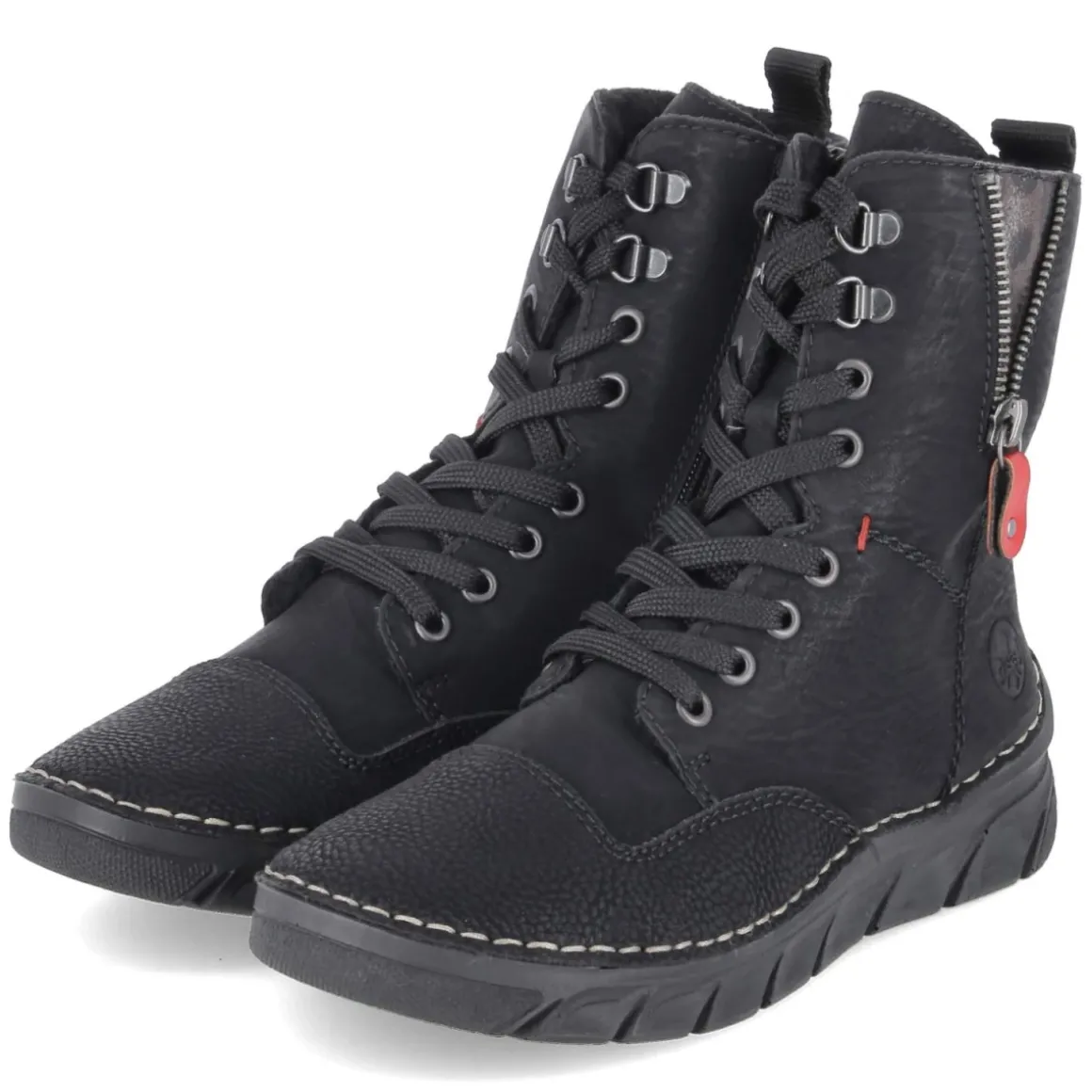 Der schwarze Damen-Boot von Rieker vereint wintertaugliche Wärme mit entspanntem Tragegefühl. Das pflegeleichte Synthetik-Obermaterial zeigt eine klare Linienführung, ergänzt durch einen Zierreißverschluss am Schaft, während die runde Spitze und der verstärkte Fersen- und Zehenbereich Alltagstauglichkeit unterstreichen. Warmfutter mit weichem Teddyfutter umschließt den Fuß, die Textil-Decksohle und das gepolsterte Fußbett sorgen für anhaltenden Komfort. Dank relaxtem Leichtgewicht und flexibler, rutschfester Laufsohle bleibt jeder Schritt angenehm und sicher. Der praktische Mix aus Schnürsenkeln und seitlichem Reißverschluss erleichtert den Einstieg, eine Anziehlasche unterstützt zusätzlich. Die Passform fällt normal aus, wodurch unkomplizierte Größenauswahl gelingt. Modetipp: Eine Kombination mit schwarzer Strumpfhose, Midirock in Wolloptik und Oversize-Strick schafft einen lässig-warmen City-Look.