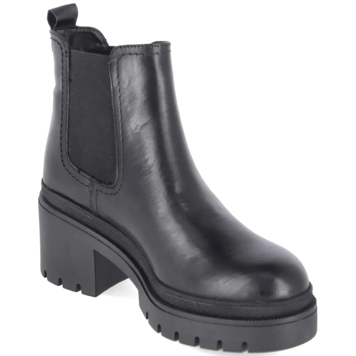 Der Chelsea Boot von Tamaris setzt auf eine moderne, klare Linie und vereint Komfort mit stilvoller Präsenz. Schwarzes Glattleder aus langlebigem Echtleder formt eine edle Optik, die runde Schuhspitze und die zwei großen, seitlichen Elastikeinsätze sorgen für den typischen Chelsea-Charakter. Dank Anziehlasche gelingt der Einstieg mühelos, der Verzicht auf einen Verschluss hält das Design pur. Ein gepolstertes Fußbett sowie die Decksohle aus Textil und Synthetik bieten ein angenehmes Tragegefühl im Alltag, während die rutschfeste Profilsohle sicheren Halt verleiht. Der 7,5 cm hohe Blockabsatz streckt die Silhouette, bleibt aber stabil und alltagstauglich. Das Modell fällt normal aus und richtet sich an erwachsene Damen, die eine moderne Optik mit Funktionalität verbinden möchten. Modetipp: Zu knöchellanger Straight-Jeans und Oversize-Blazer entsteht ein urbaner Look, der sowohl im Büro als auch am Abend überzeugt.