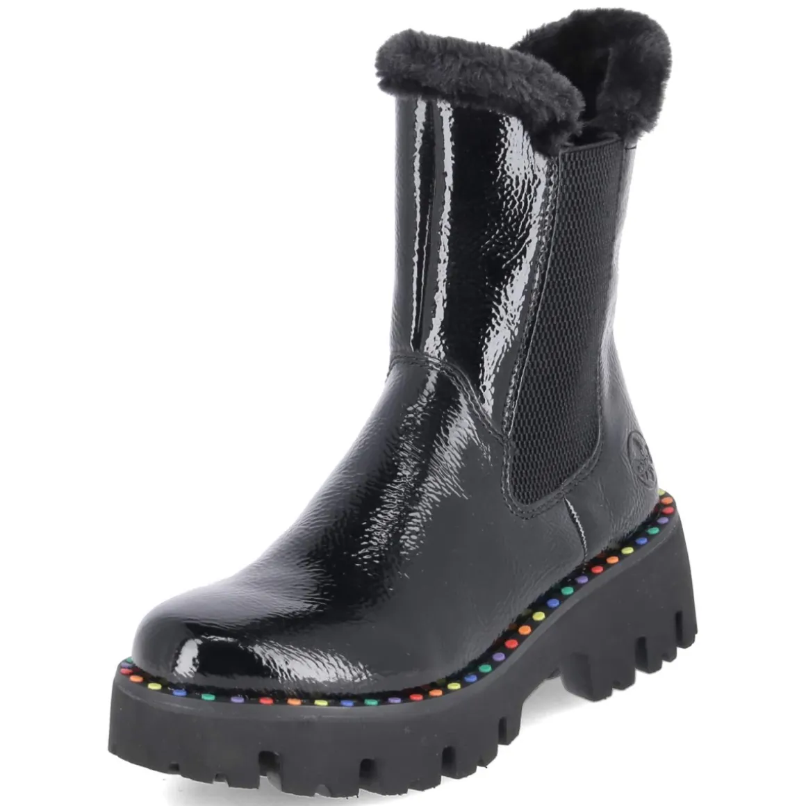 Diese Chelsea Boots von Rieker verbinden elegante Lackoptik mit wintertauglichem Komfort. Das schwarze Obermaterial aus Synthetik glänzt stilvoll und wird von einer Schaftkrempe mit Kunstfellbesatz akzentuiert, während der bunt gepunktete Sohlenrahmen eine moderne Note setzt. Das Warmfutter umschließt den Fuß angenehm, die weiche Decksohle aus Textil und das austauschbare Wechselfußbett sorgen für individualisierbaren Komfort. Dank rutschhemmender Laufsohle und stabilem 5-cm-Blockabsatz gelingt der Auftritt souverän, der Reißverschluss ermöglicht schnelles An- und Ausziehen. Der Schnitt fällt schmaler aus und betont die schlanke Silhouette, die runde Spitze hält den Look klassisch. Ein relaxtes Leichtgewicht für lange Tage in Stadt und Büro. Modetipp: Mit Wollmantel, Feinstrickkleid und blickdichter Strumpfhose entsteht ein urbaner Chic, der die glänzende Oberfläche effektvoll in Szene setzt.