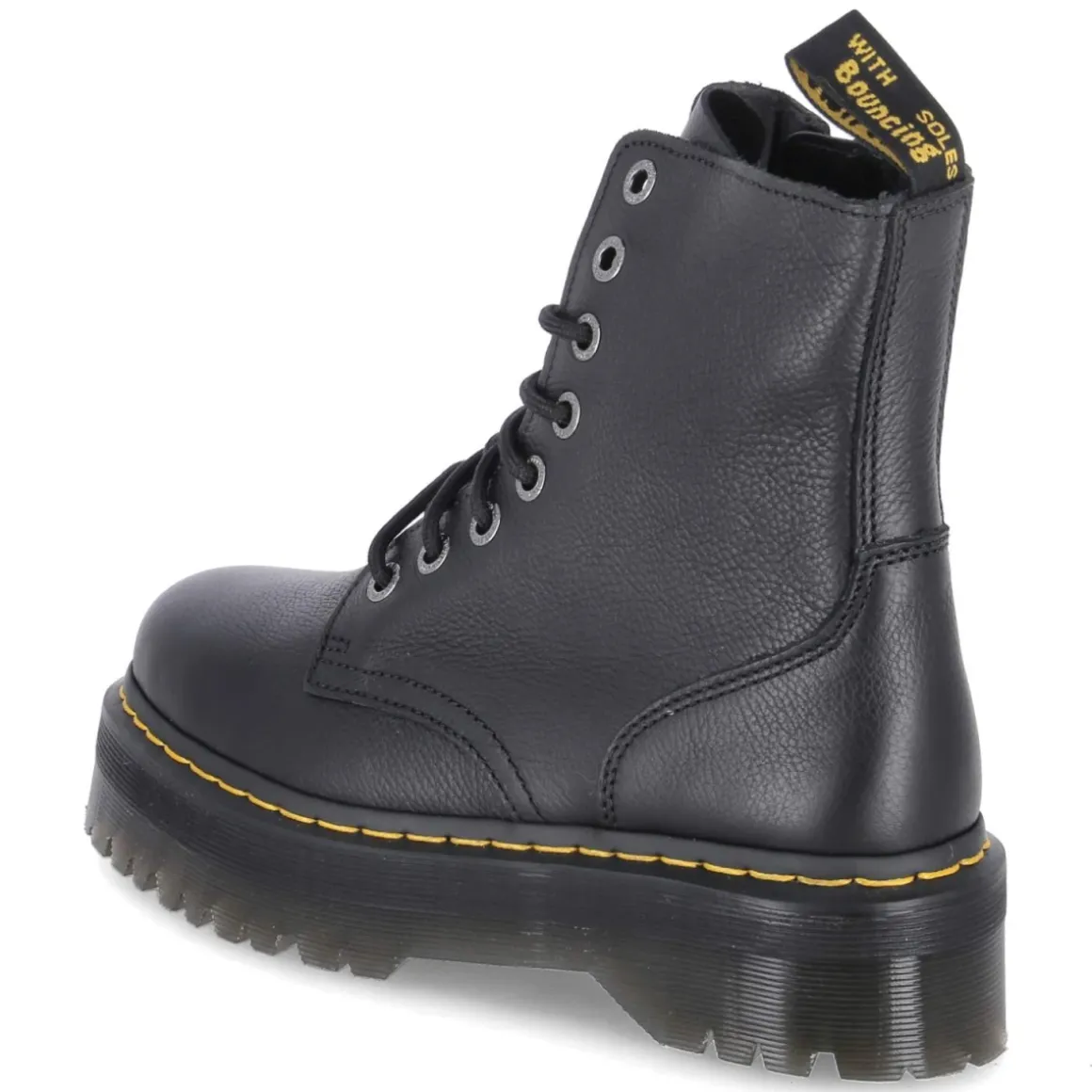 Der Combat Boot JADON III von Dr. Martens liefert markante Höhe und Standfestigkeit. Schwarzes Glattleder in robuster Qualität trifft auf eine vernähte Plateau-Profillaufsohle mit 5 cm Absatz, deren rutschhemmendes Profil zuverlässigen Grip bietet. Die runde Schuhspitze und der verstärkte Fersenbereich sorgen für Komfort und Formstabilität, während Schnürung und zusätzlicher Reißverschluss das An- und Ausziehen erleichtern. Innen verwöhnen Textilfutter und eine Lederdecksohle mit weichem Fersenpolster. Eine Anziehlasche setzt den ikonischen Akzent. Der Leisten fällt normal aus und bietet die typische Dr. Martens Passform. Modetipp: Besonders wirkungsvoll zu monochromen Looks mit Lederjacke und verkürzter Straight-Leg-Jeans oder als Kontrast zum fließenden Midikleid.