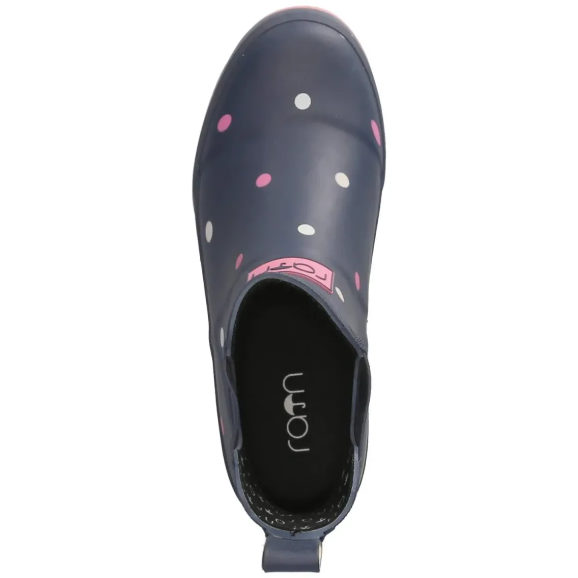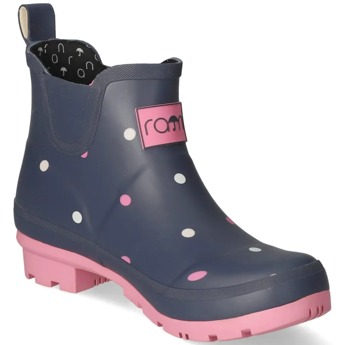 Der Gummistiefel Dots von Rajn verbindet fröhliches Design mit zuverlässigem Wetterschutz. Das wasserfeste Gummiobermaterial in Blau mit rosafarbenen und weißen Punkten hält trocken, während die runde Spitze und der normal ausfallende Leisten für angenehmen Tragekomfort stehen. Seitliche Elastikeinsätze und eine Anziehlasche ermöglichen einen unkomplizierten Einstieg. Innen sorgt eine textile Decksohle zusammen mit dem gepolsterten, herausnehmbaren Wechselfußbett für weiche Dämpfung. Ein verstärkter Fußrahmen stabilisiert, die flexible Profilsohle bietet rutschhemmenden Grip, und ein Reflektorstreifen an der Ferse erhöht die Sichtbarkeit. Ideal für nasse Tage in der Stadt oder auf dem Land, robust und zugleich verspielt. Modetipp: In Kombination mit gelbem Regenmantel und schmaler Cropped-Jeans entsteht ein frischer Kontrast, ein gestreifter Pullover greift das Muster lässig auf.