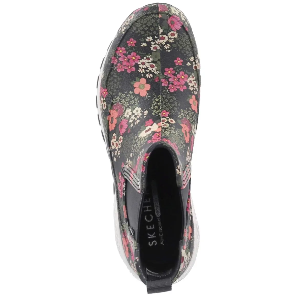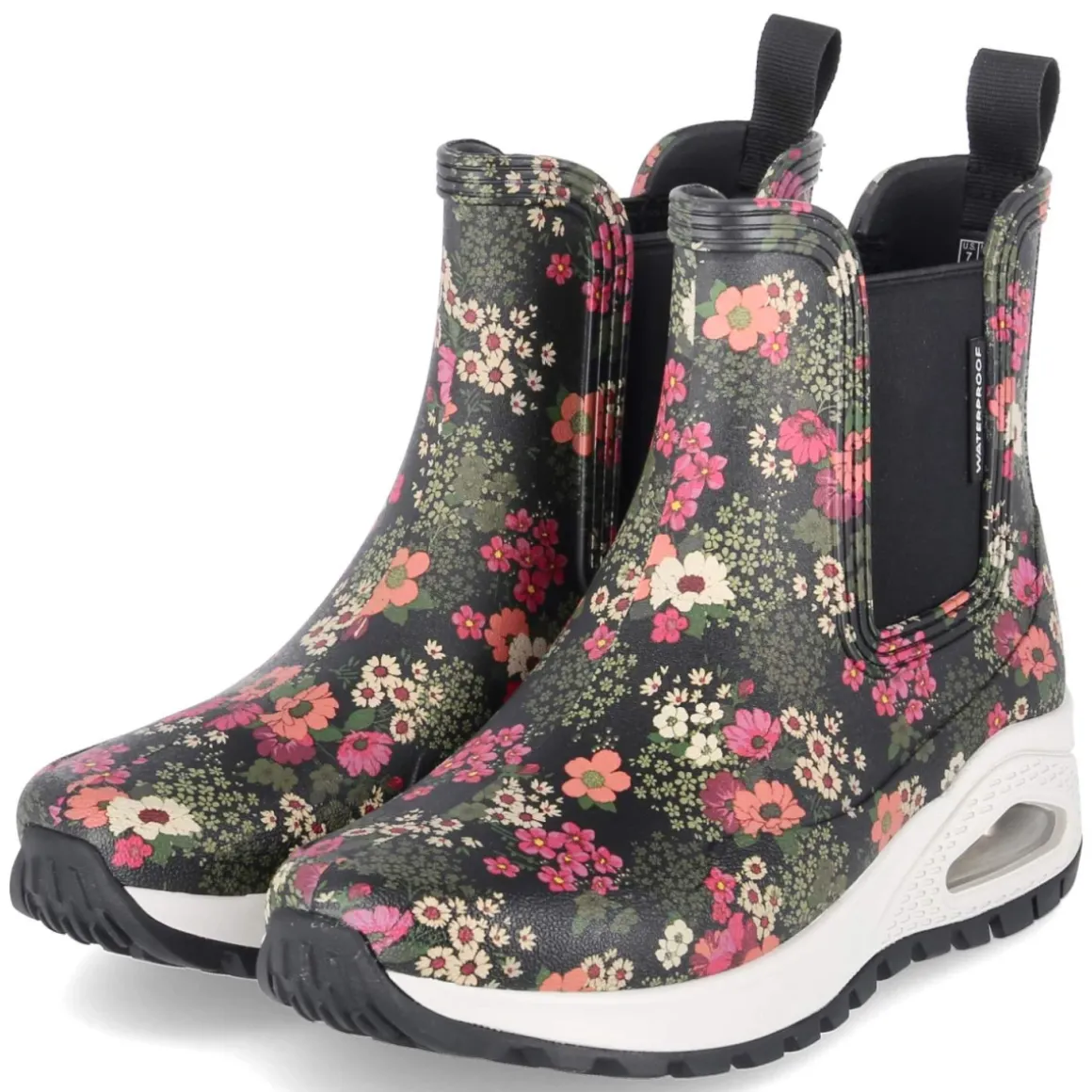 Die Gummistiefeletten UNO RUGGED von Skechers vereinen funktionalen Wetterschutz mit lebensfrohem Design. Das Chelsea-Boot-Layout „DANCING N THE RAIN“ zeigt einen bunten Blumenprint und kommt ohne Verschluss aus; zwei Elastikeinsätze und eine Anziehlasche erleichtern den Einstieg und sorgen für passgenauen Halt. Das wasserabweisende Obermaterial aus Synthetik hält Regen zuverlässig fern, während der verstärkte Fußrahmen Stabilität bietet. Eine sportliche, rutschfeste Profilsohle mit dekorativem Sichtfenster sorgt für Grip auf nassem Untergrund. Innen verwöhnt die Textil-Decksohle in Kombination mit der besten Memory-Foam-Fußbettung mit weicher Dämpfung – ideal für lange Tage. Der runde Zehenbereich und die reguläre Passform unterstützen den komfortablen Charakter. Modetipp: Zum farbigen Blumenprint harmonieren ein klassischer Trenchcoat und Cropped-Jeans; dazu feine Rippstrümpfe in einer der Printfarben für ein stimmiges Finish.