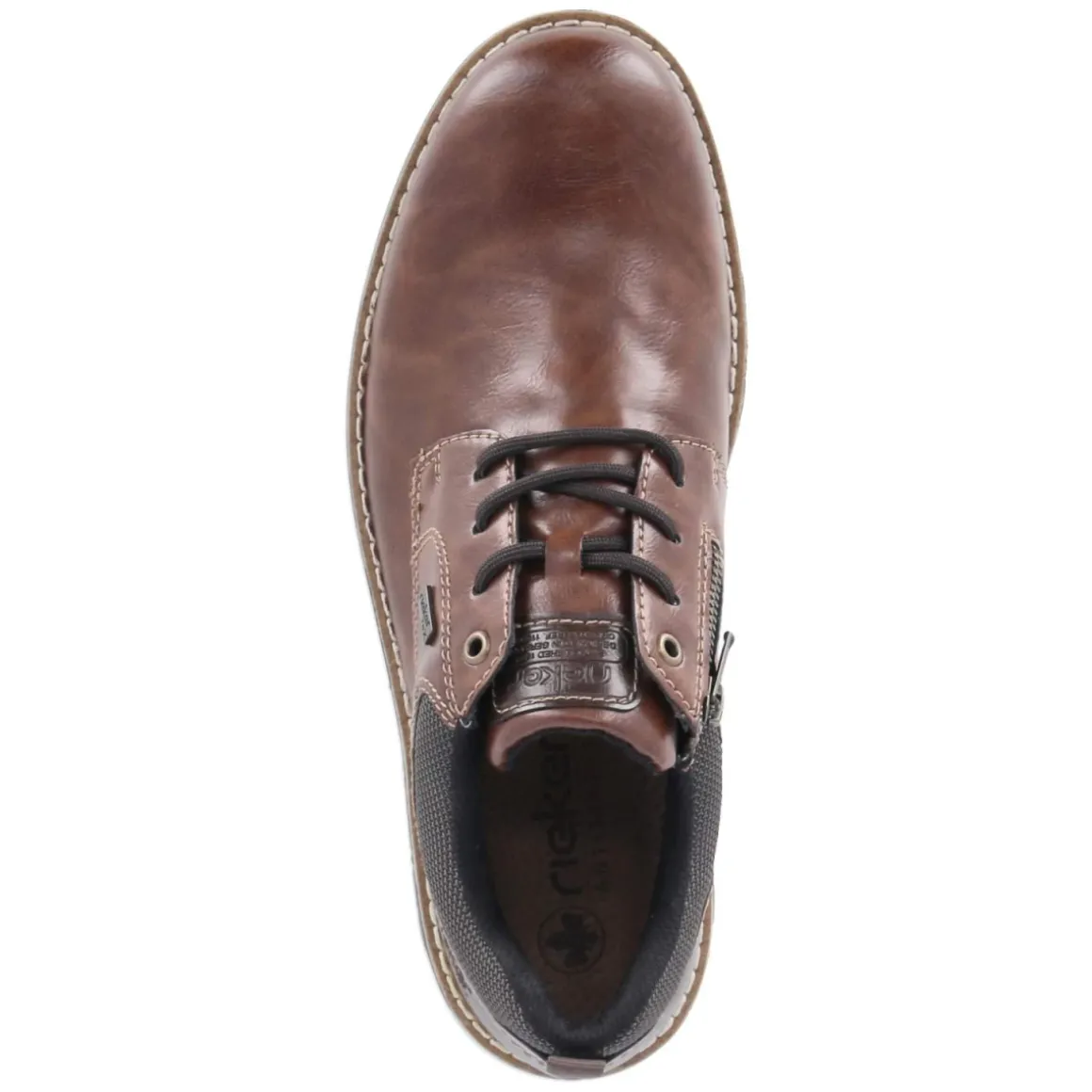 Der braune Herren-Halbschuh von Rieker kombiniert sportliches Design mit verlässlichem Komfort für den Alltag. Das pflegeleichte Obermaterial aus Synthetik zeigt eine dezente Struktur und wird von einer runden Spitze abgerundet, während Schnürsenkel und seitlicher Reißverschluss das An- und Ausziehen besonders unkompliziert machen. Eine weiche Decksohle aus Leder unterstützt das Fußwohl, der gepolsterte Einstieg und die verstärkte Ferse bieten angenehmen Halt. Die flexible, rutschhemmende Profilsohle sorgt für sicheren Tritt auf urbanen Wegen. Der Schnitt fällt normal aus und passt zu vielfältigen Outfits zwischen Büro und Freizeit. Modetipp: In Kombination mit dunkelblauen Chinos, einem schlichten Strickpullover und einem braunen Gürtel entsteht ein stimmiger Smart-Casual-Look, der die warme Farbigkeit des Modells elegant aufgreift.