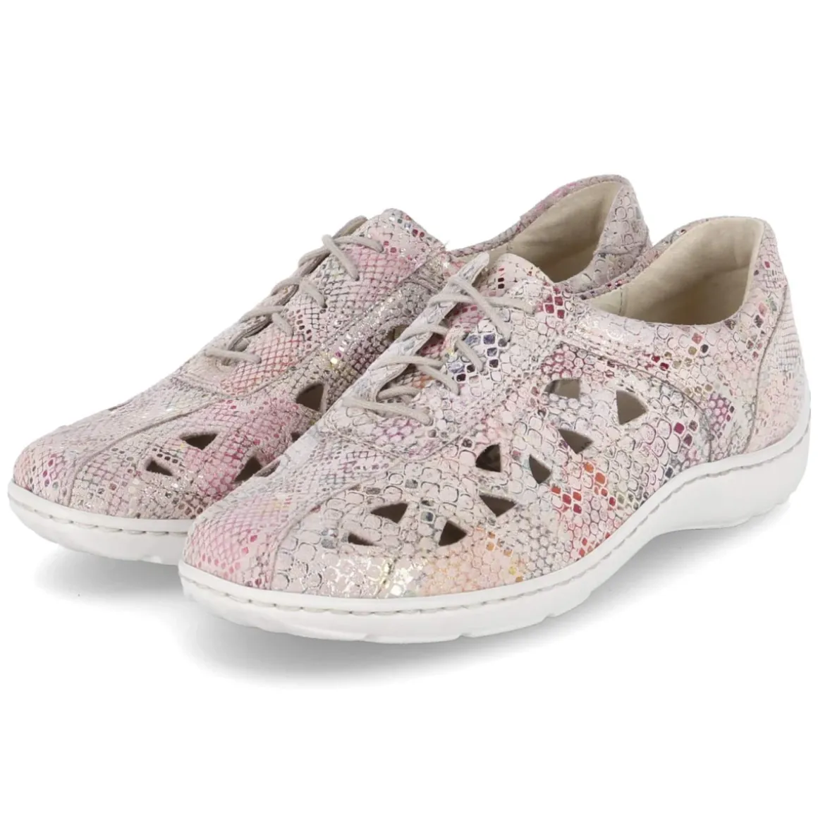 Der Halbschuh HENNI von Waldläufer vereint feminine Leichtigkeit mit funktionalem Komfort. Zartes Rosa trifft auf weiches Rauleder in langlebiger Echtleder-Qualität, akzentuiert von einem mehrfarbigen, metallischen Reptilprint. Gelochte Partien und luftige Cutouts im vorderen Bereich fördern die Atmungsaktivität, die runde Spitze und die verstärkte Ferse unterstützen ein entspanntes Tragegefühl. Das gepolsterte, herausnehmbare Lederfußbett lässt sich bei Bedarf gegen eigene Einlagen tauschen; die flexible, rutschfeste Laufsohle sorgt bei geringem Gewicht für Stabilität. Per Schnürung individuell anpassbar und in der Passform zuverlässig, da das Modell normal ausfällt. Ein lässig-eleganter Begleiter für Alltag und Freizeit. Modetipp: Zu hellen Denim-Culottes und einem feinen Stricktop getragen, kommen Rosa-Ton und Reptilakzent modern zur Geltung.