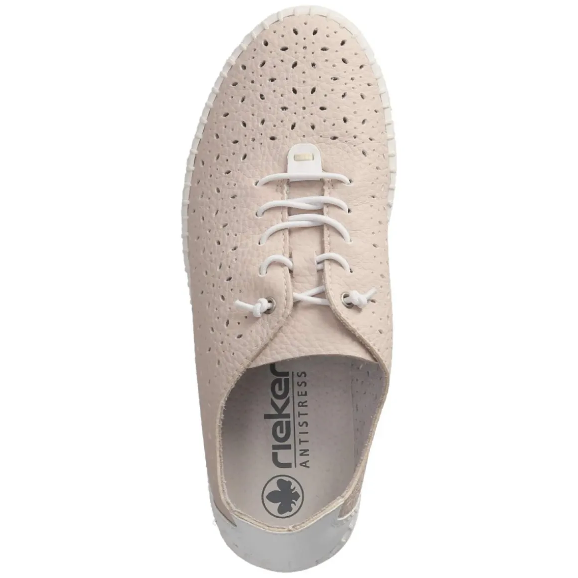 Der Rieker Halbschuh in Taupe kombiniert luftige Leichtigkeit mit komfortorientiertem Design. Gelochtes Obermaterial aus glattem, atmungsaktivem Echtleder und ein angenehmes Lederfutter sorgen für ein frisches Fußklima, während die runde Schuhspitze und die gepolsterte Decksohle aus Leder spürbare Bequemlichkeit bieten. Die flexible, rutschhemmende Laufsohle gibt Halt im Alltag, der verstärkte Fersenbereich stabilisiert bei jedem Schritt. Praktisch: der Schnürverschluss mit bequemer Elastikschnürung erleichtert den Einstieg und sitzt zuverlässig, ganz ohne Druckstellen. Weißfarbene Akzente und dezente Markendetails setzen moderne Highlights. Das Modell fällt normal aus und ist ideal für Damen, die einen vielseitigen Begleiter suchen. Modetipp: zu cropped Jeans, leichter Leinenbluse und einer hellen Crossbody-Bag kombinieren.