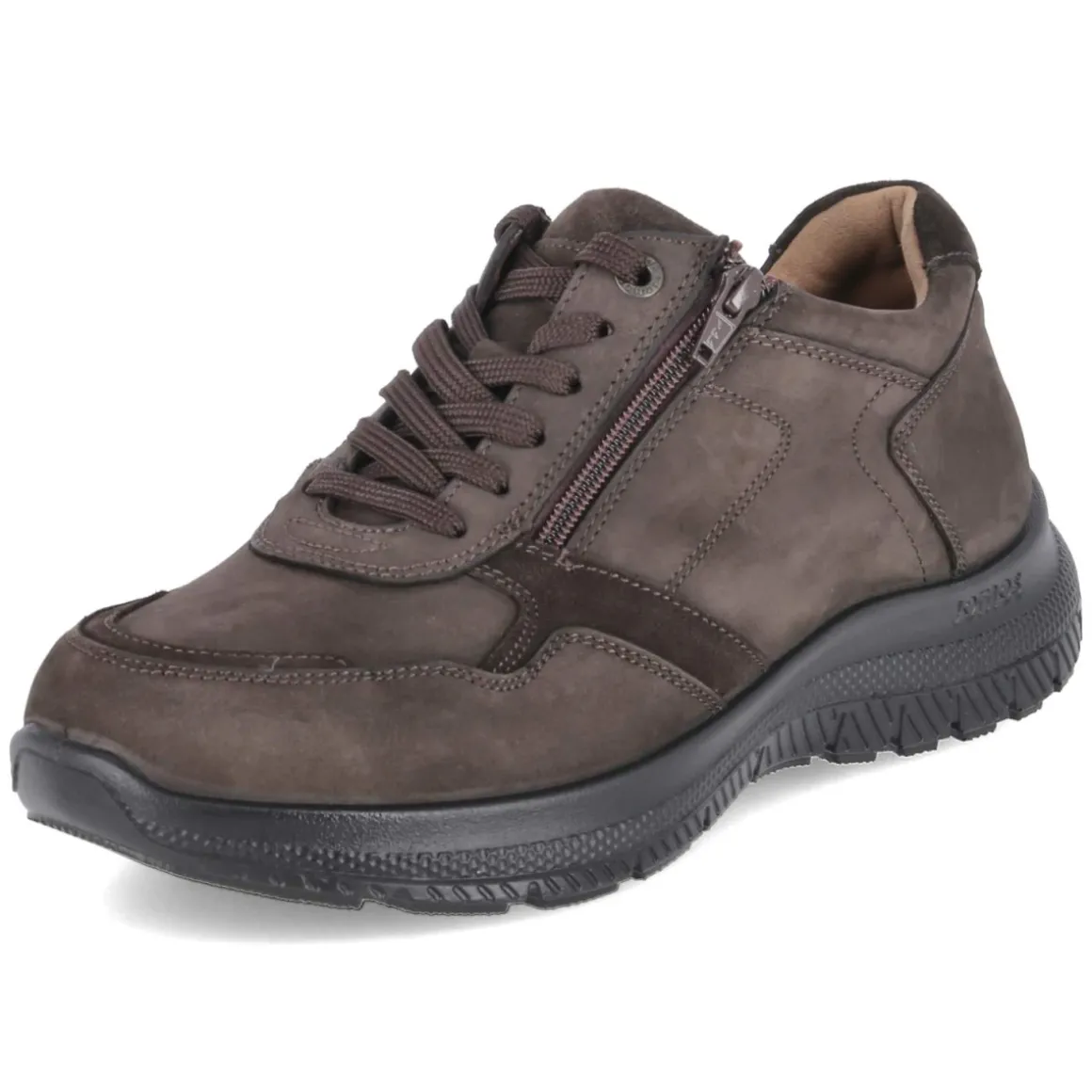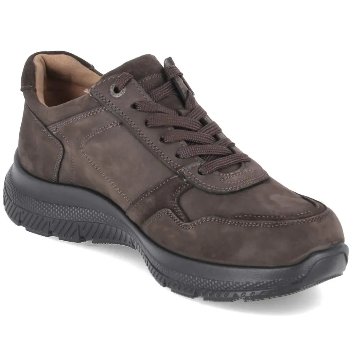 Dieser Herren-Halbschuh von Jomos vereint funktionale Details mit zeitloser Optik. Das Obermaterial aus robustem Rauleder in warmem Braun erhält durch feine Ziernähte eine wertige Note, während die runde Schuhspitze und die normale Passform ein angenehmes Tragegefühl im Alltag unterstützen. Schnürung und zusätzlicher Reißverschluss sorgen für bequemen Einstieg und sicheren Sitz, besonders praktisch im schnellen Alltag. Die textile Decksohle liegt weich am Fuß und das komfortable Wechselfußbett lässt sich bei Bedarf gegen eigene Einlagen tauschen. Verstärkter Fersen- und Zehenbereich geben Stabilität, der gepolsterte Einstieg schont den Knöchel. Eine flexible, rutschfeste Laufsohle bietet verlässlichen Grip. Modetipp: Zu Chinos in Dunkeloliv und einem gestrickten Poloshirt entsteht ein smart-lässiger Look für Büro und Freizeit.