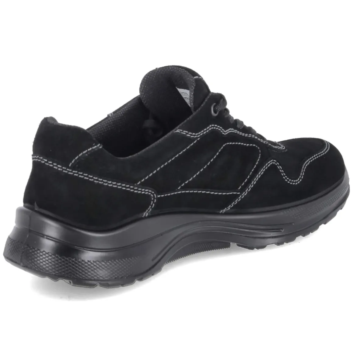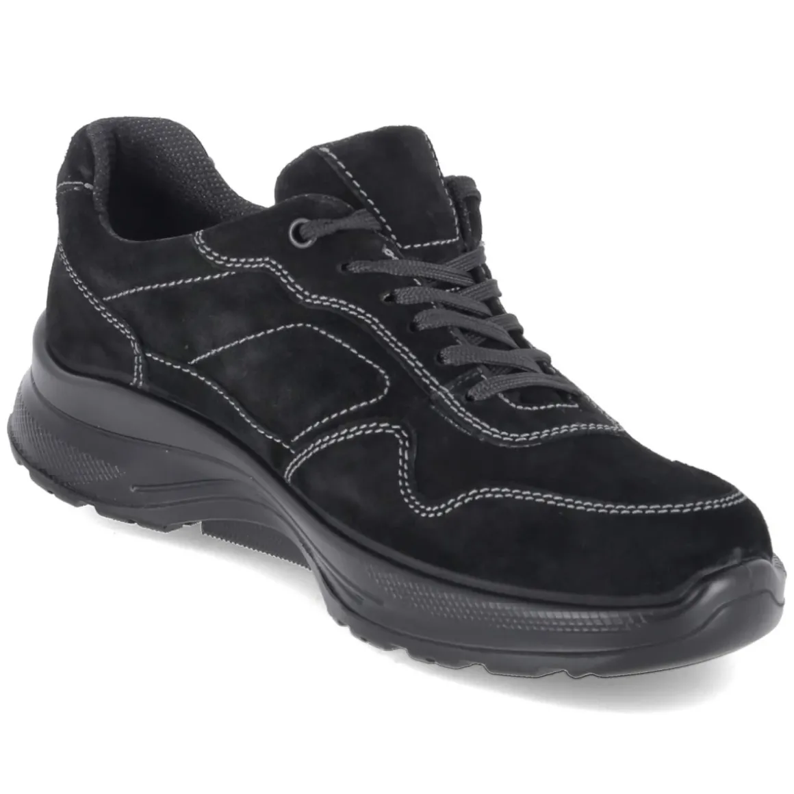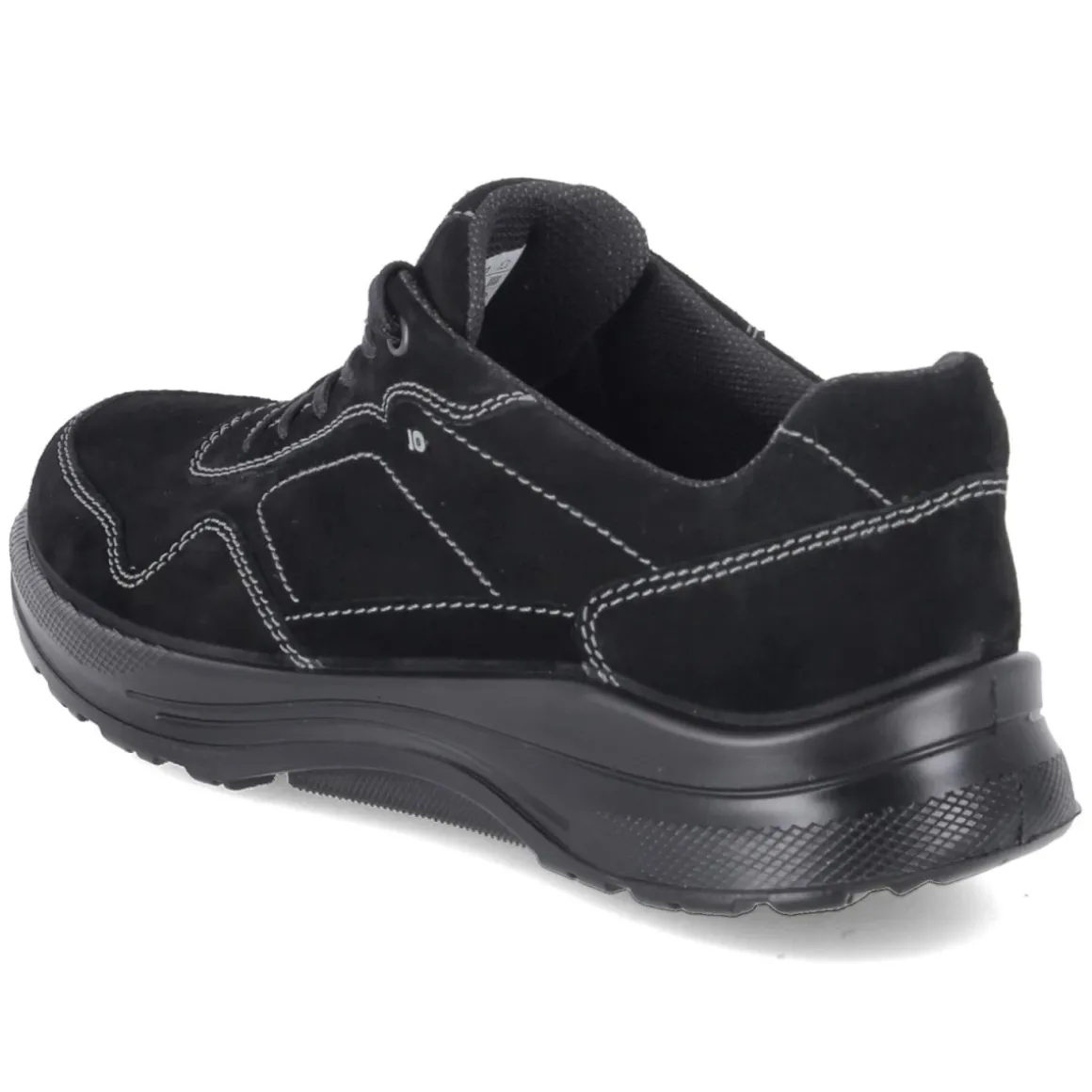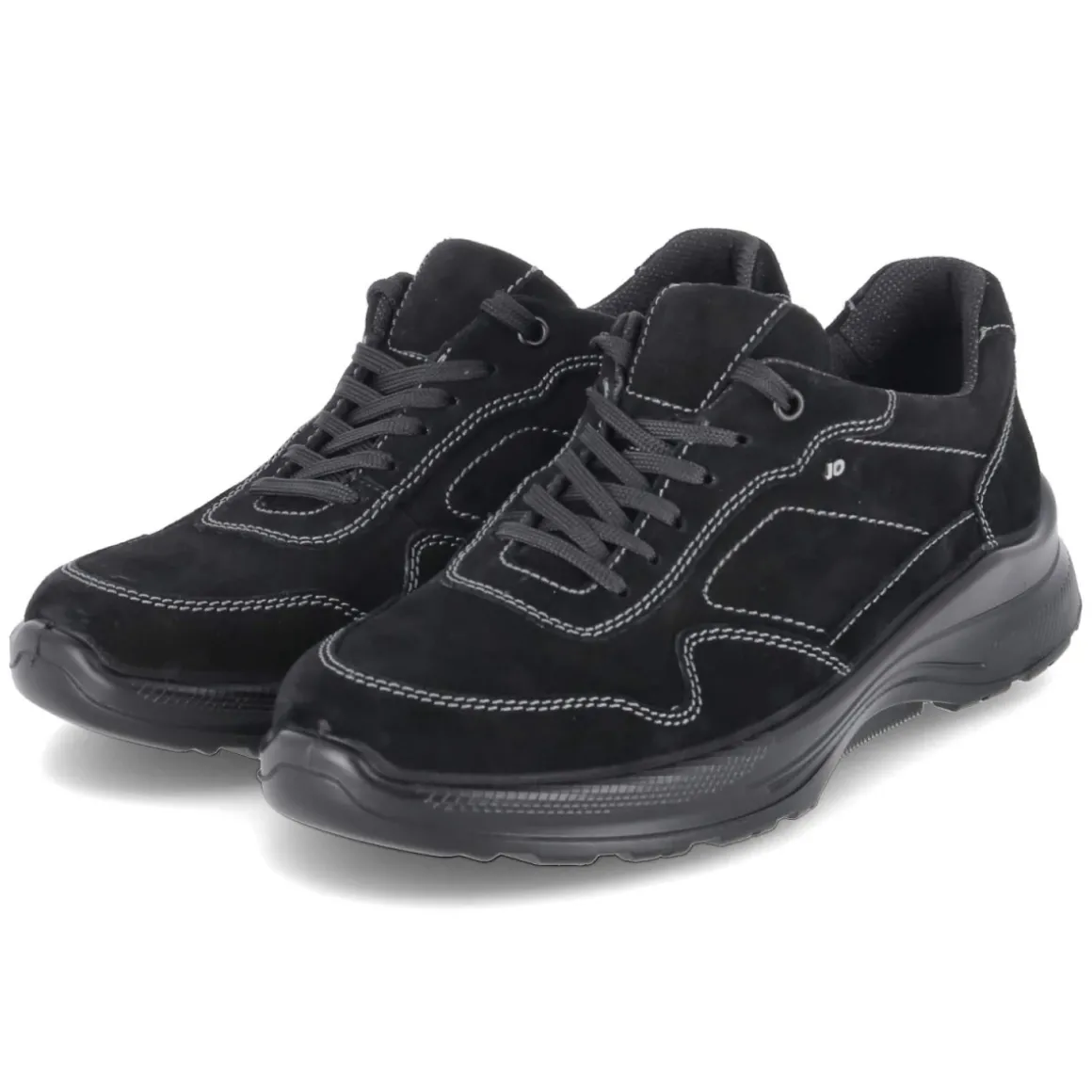 Der schwarze Herren-Halbschuh von Jomos vereint sportliches Design mit zuverlässiger Alltagstauglichkeit. Das Obermaterial aus robustem Rauleder in Echtleder-Qualität zeigt sich widerstandsfähig, während die markanten Ziernähte dem dezenten Look Struktur geben. Schnürsenkel und runde Spitze sorgen für eine komfortable Passform, unterstützt von einem verstärkten Fersen- und Zehenbereich sowie einem gepolsterten Einstieg. Innen verwöhnt eine textile Decksohle; das herausnehmbare Fußbett mit bester Memory-Foam-Fußbettung passt sich weich an und lässt sich bei Bedarf gegen eigene Einlagen tauschen. Die flexible, rutschfeste Laufsohle bietet Grip auf urbanem Terrain. Fällt normal aus und ist damit unkompliziert in der Wahl der Größe. Modetipp: Zu schwarzer Jeans und einem cleanen Overshirt entsteht ein smarter Look, der vom Büro bis in den Feierabend souverän funktioniert.