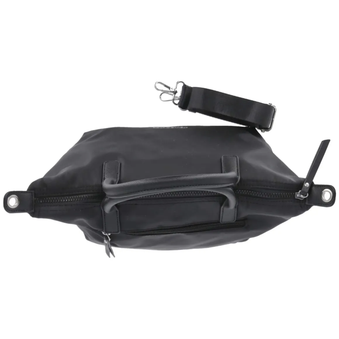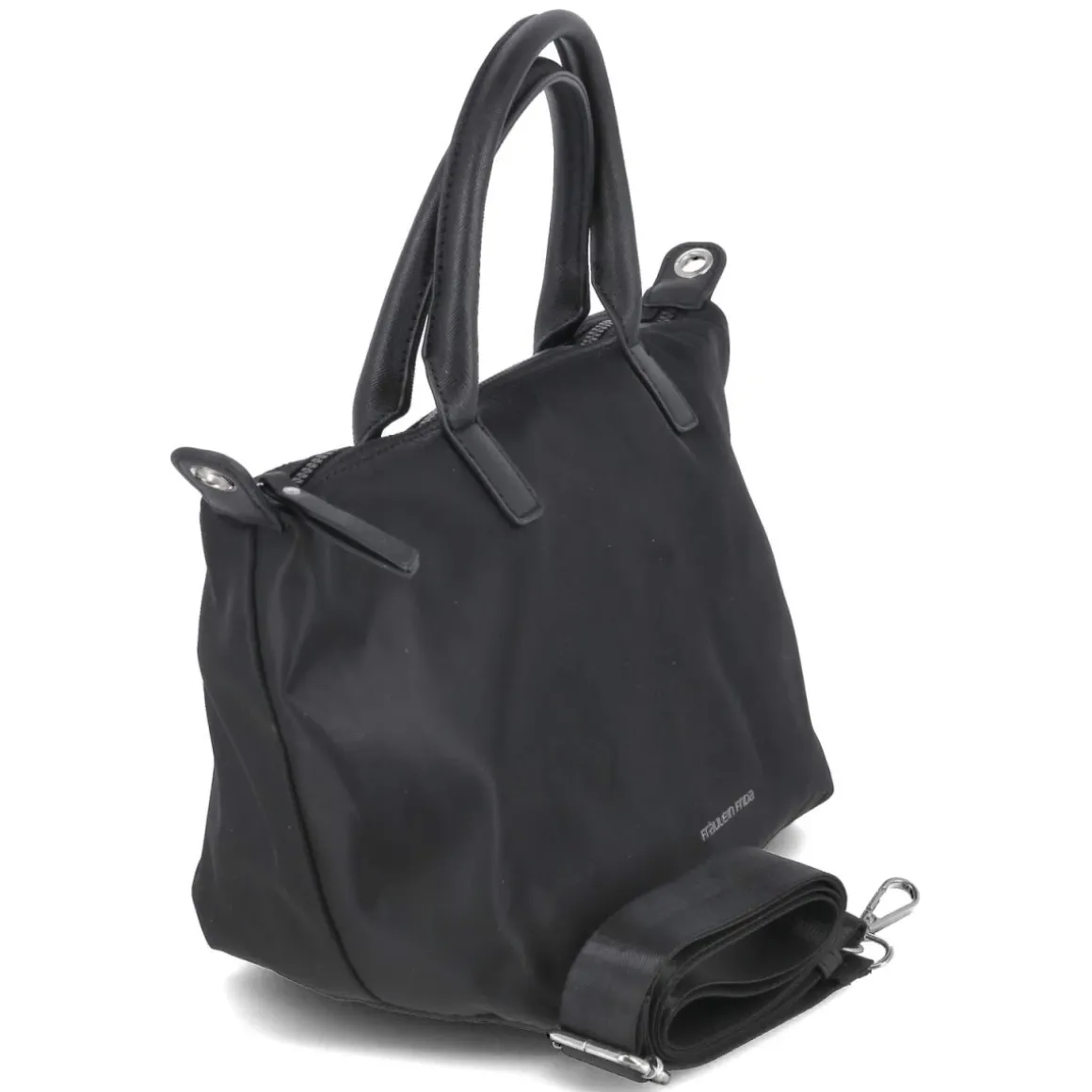 Diese schwarze Handtasche überzeugt als eleganter Alltagsbegleiter mit klarem Design und durchdachter Funktion. Das kompakte Format von ca. 21 x 25 x 15 cm fasst mit rund 7 Litern alles Wichtige, während der sichere Reißverschluss den Inhalt schützt. Zwei feste Tragehenkel sorgen für eine klassische Silhouette, der verstellbare und abnehmbare Schultergurt mit ca. 140 cm Länge ermöglicht Tragen über der Schulter oder quer. Außen bietet ein rückseitiges Reißverschlussfach schnellen Zugriff, innen strukturieren ein Steckfach und ein weiteres Reißverschlussfach Dokumente, Schlüssel und Smartphone. Der sachliche Look harmoniert mühelos mit Business- wie Casual-Outfits. Modetipp: Im monochromen Ensemble mit Oversize-Blazer, feiner Strickhose und Loafern entsteht ein moderner City-Look mit ruhiger Eleganz.