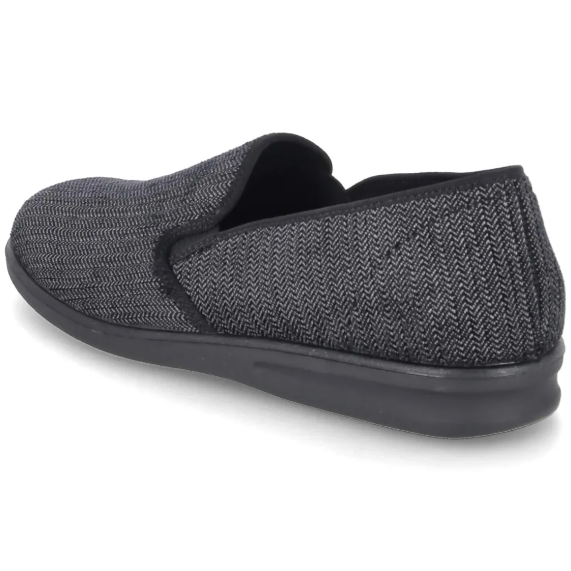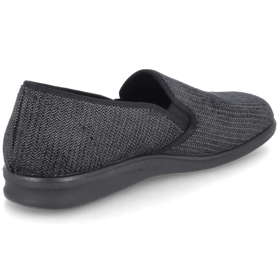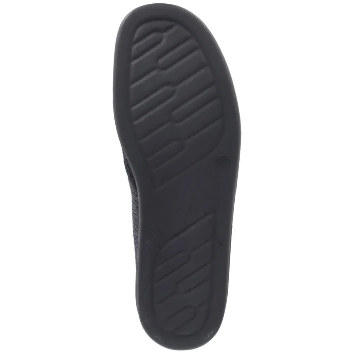 Der Hausschuh BELFORT 122 von Josef Seibel setzt auf entspannten Komfort mit einem robusten Textilobermaterial und zeitloser Ästhetik. In tiefem Schwarz gehalten, wird das dezente Fischgrätmuster zum eleganten Detail, das den klassischen Look unaufdringlich unterstreicht. Die runde Schuhspitze sorgt für ausreichend Zehenfreiheit, während seitliche Elastikeinsätze den Einstieg erleichtern und für einen sicheren Sitz ohne Druckpunkte stehen. Die flexible Laufsohle unterstützt natürliche Abrollbewegungen, das geringe Gewicht entlastet bei jedem Schritt. Innen bietet die Decksohle aus Leder-Textil eine angenehme Haptik und ein ausgewogenes Tragegefühl. Der Schnitt fällt normal aus und überzeugt im Alltag ebenso wie in entspannten Momenten nach langen Tagen. Modetipp: Zu einer feinen Strickhose und schmalem Cardigan tragen, dazu gemütliche, einfarbige Socken – so entsteht ein aufgeräumter Loungeblick mit subtiler Struktur.
