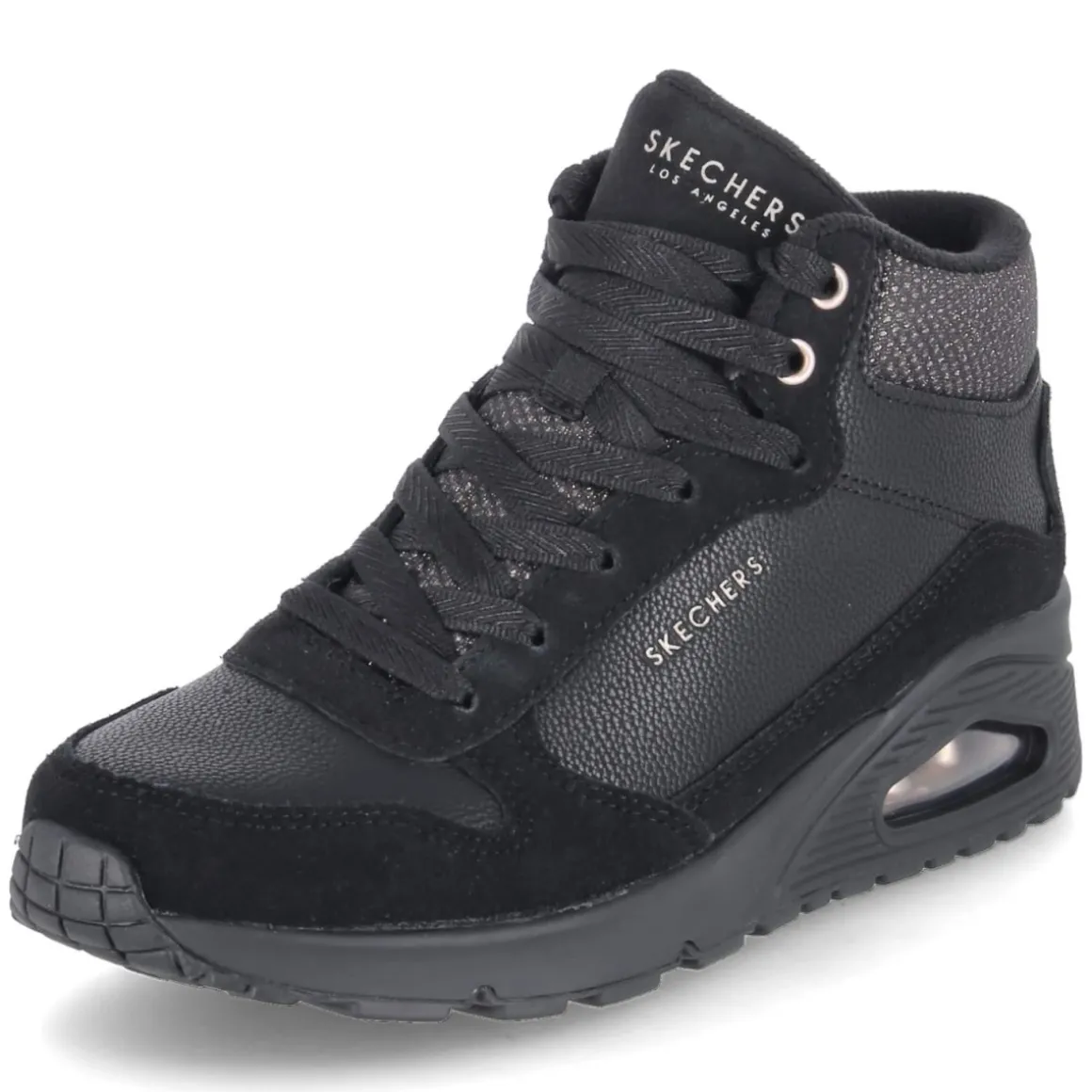 Der High Sneaker UNO-STARCE SHINE von Skechers verbindet urbanen Chic mit durchdachtem Komfort. Der moderne Material-Mix aus Leder und Synthetik trifft auf golden schimmernde Highlights, die auf dem tiefschwarzen Upper edel zur Geltung kommen. Die hohe Silhouette mit runder Spitze umschließt den Fuß sicher, während das beste Memory-Foam-Fußbett und die textile Decksohle soft abfedern. Die flexible, rutschfeste Laufsohle mit Sichtfenster in der Ferse unterstützt ein angenehmes Abrollen, der Zehen- und Fersenbereich ist robust verstärkt. Eine klassische Schnürung wird durch praktische Klettdetails sinnvoll ergänzt und erleichtert das An- und Ausziehen. Leichtes Futter macht den Sneaker zur smarten Wahl für kühle Tage. Fällt normal aus. Modetipp: Mit Cropped-Jeans, Oversize-Blazer und feinen Stricksocken entsteht ein moderner City-Look, der die goldenen Akzente stilvoll aufgreift.