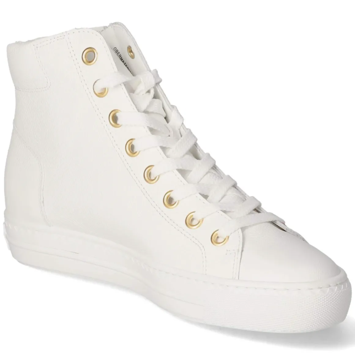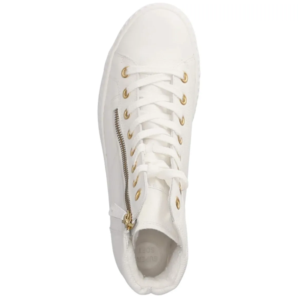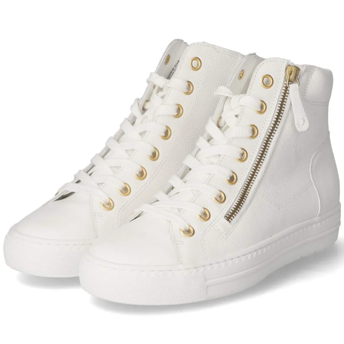Der High Sneaker von Paul Green bringt cleanen Weißton und fein gearbeitetes Glattleder in eine zeitlose Silhouette, die Damen im Alltag wie auf Reisen begleitet. Atmungsaktives Echtleder und eine lederne Decksohle sorgen für ein ausgeglichenes Fußklima, das gepolsterte Fußbett und der weich gepolsterte Einstieg bieten langanhaltenden Komfort. Die runde Spitze lässt den Look lässig wirken, während goldfarbene Akzente an Schnürung und Reißverschluss eine edle Note setzen. Praktisch: Neben der Schnürung erleichtert der zusätzliche Reißverschluss das An- und Ausziehen. Eine flexible Laufsohle mit Grip gibt sicheren Halt, die verstärkte Ferse stabilisiert bei jedem Schritt. Ziernähte und dezente Markendetails runden das Design ab. Der Schuh fällt normal aus. Modetipp: Besonders modern wirkt der Sneaker zu Cropped-Jeans und Trenchcoat oder als stilvoller Kontrast zu einem fließenden Midikleid.