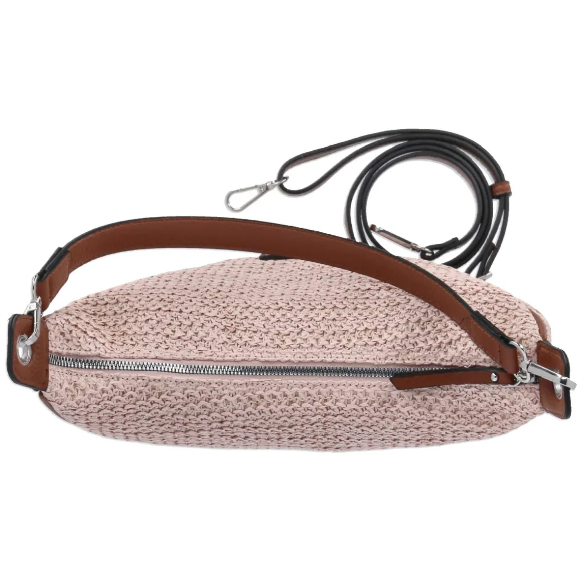 Diese Hobo Bag in zartem Rosa setzt mit ihrer geflochtenen Oberfläche und den kontrastierenden braunen Kunstlederelementen einen femininen Akzent. Die geschmeidige Silhouette bietet mit ca. 8 Litern Volumen ausreichend Platz, während das Reißverschluss-Hauptfach alles sicher verwahrt. Innen strukturieren ein Steckfach und ein zusätzliches Reißverschlussfach die Essentials. Der kurze Riemen (ca. 40 cm) erlaubt lässiges Tragen in der Hand oder über dem Arm, der verstellbare, abnehmbare Schultergurt (ca. 140 cm) sorgt für flexible Crossbody-Optionen. Mit Maßen von ca. 20 x 35 x 12 cm bleibt das Format handlich und dennoch alltagstauglich. Vegan verarbeitete Kunstlederelemente runden das moderne Materialspiel ab. Modetipp: Zu hellen Denim-Looks und sanften Pastelltönen kombinieren, dazu filigrane Mules oder minimalistische Sneakers für ein stimmiges Finish.