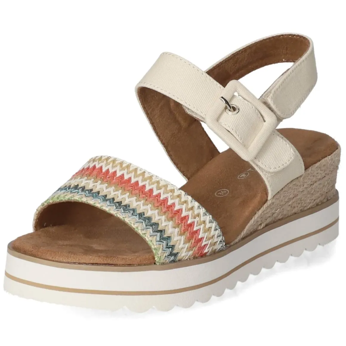 Sommerlicher Auftritt mit Charakter: Die Tom Tailor Keilsandaletten für Damen verbinden ein natürliches Design mit lebhaftem Mehrfarb-Look. Das buntfarbene Zickzack-Muster in Sisaloptik verleiht jedem Paar eine individuelle Note, da der Farbverlauf je Schuh variieren kann. Obermaterial, Decksohle und Futter aus angenehm weichem Textil sorgen zusammen mit dem gepolsterten Fußbett für spürbaren Komfort. Zwei praktische Klettverschlüsse und eine Zierschnalle unterstreichen die lässige Optik und sichern eine passgenaue Einstellung. Der leichte Keilabsatz von 5 cm streckt subtil, bleibt aber den ganzen Tag über bequem. Mit rund gearbeiteter Schuhspitze und größengetreuem Sitz wird ein unkomplizierter Begleiter für City, Urlaub und Gartenfest geboten. Modetipp: Zu unifarbenen Leinenkleidern oder Cropped-Jeans stylen, dazu Korbtasche und zarte Gold-Accessoires für einen harmonischen Sommer-Look.