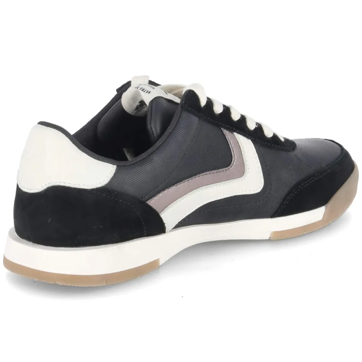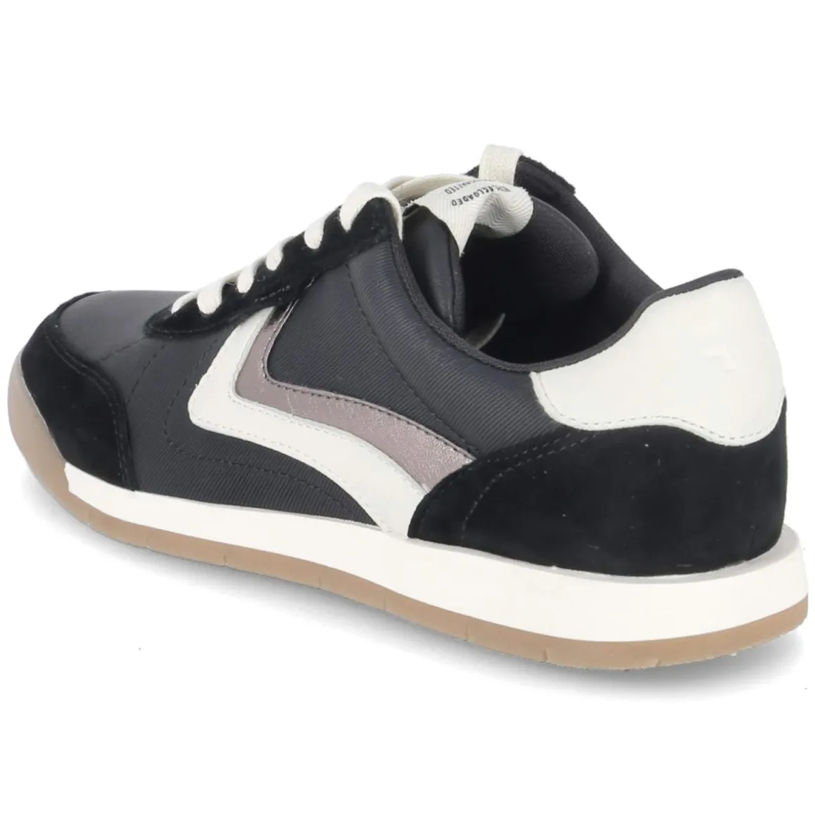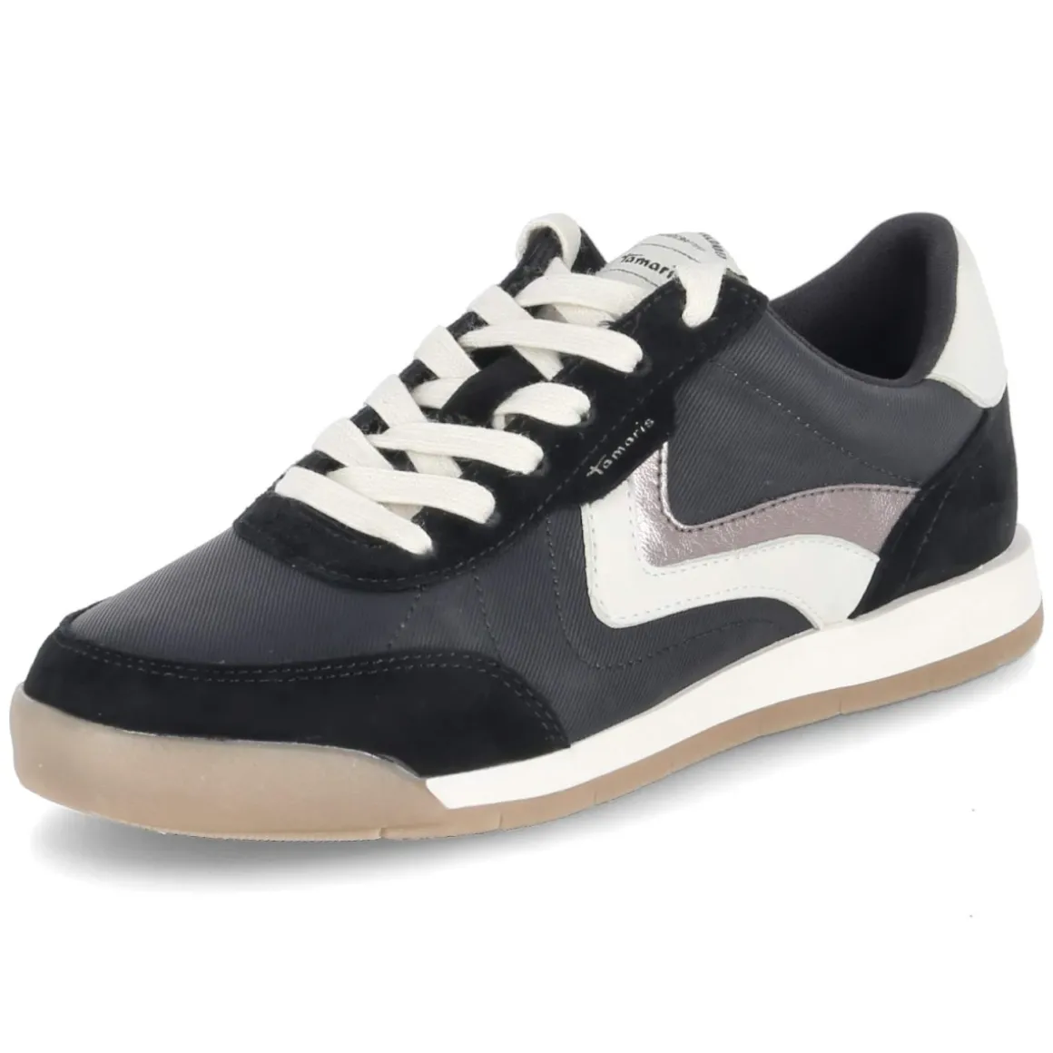 Der Low Sneaker von Tamaris setzt auf einen modernen Material-Mix aus Leder und Synthetik, der sportliche Lässigkeit mit eleganten Akzenten verbindet. Die runde Schuhspitze und die klassische Schnürung sorgen für einen sicheren Sitz, während der gepolsterte Einstieg angenehm umschließt. Weiße und metallisch bronzefarbene Seitenstreifen verleihen dem cleanen Schwarz einen dezenten Hingucker. Ein komfortables, herausnehmbares Wechselfußbett trifft auf eine textile Decksohle für ein angenehmes Tragegefühl im Alltag. Die flexible, rutschfeste Laufsohle unterstützt einen geschmeidigen Abrollvorgang, der verstärkte Fersen- und Zehenbereich gibt zusätzliche Stabilität. Der Schnitt fällt normal aus und bietet vielseitige Kombinationsmöglichkeiten vom Büro bis zur Freizeit. Modetipp: Besonders stimmig wirkt der Sneaker zu schwarzen Straight-Leg-Jeans, weißem Shirt und Oversize-Blazer; Accessoires in Bronze greifen den Streifen smart auf.