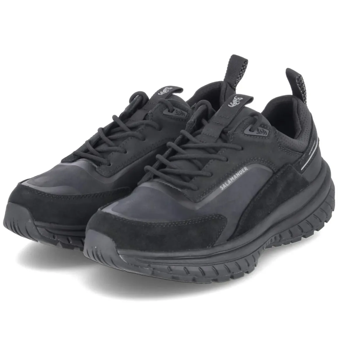 Der Low Sneaker von Salamander verbindet wetterfeste Funktion mit dynamischem Design. Das Obermaterial aus Leder und Synthetik ist wasserabweisend und zugleich wasserfest verarbeitet, während atmungsaktive Zonen für ein ausgeglichenes Fußklima sorgen. Die rutschfeste Profilsohle gibt sicheren Grip auf nassen Wegen, reflektierende Details erhöhen die Sichtbarkeit in der Dämmerung. Ein gepolsterter Einstieg, die Anziehlasche und der verstärkte Fersen- sowie Zehenbereich steigern den Tragekomfort im Alltag. Dank Wechselfußbett lässt sich die Dämpfung an persönliche Bedürfnisse anpassen; die textile Decksohle fühlt sich angenehm an. Die runde Spitze und die präzise Schnürung garantieren eine stabile Passform bei normal ausfallender Größe. In tiefem Schwarz vielseitig kombinierbar, mit dezenten Markendetails sportlich akzentuiert. Modetipp: Ton-in-Ton mit schwarzer Slim-Jeans und Tech-Parka oder als Kontrast zu grauer Wollhose und Strickpolo tragen.