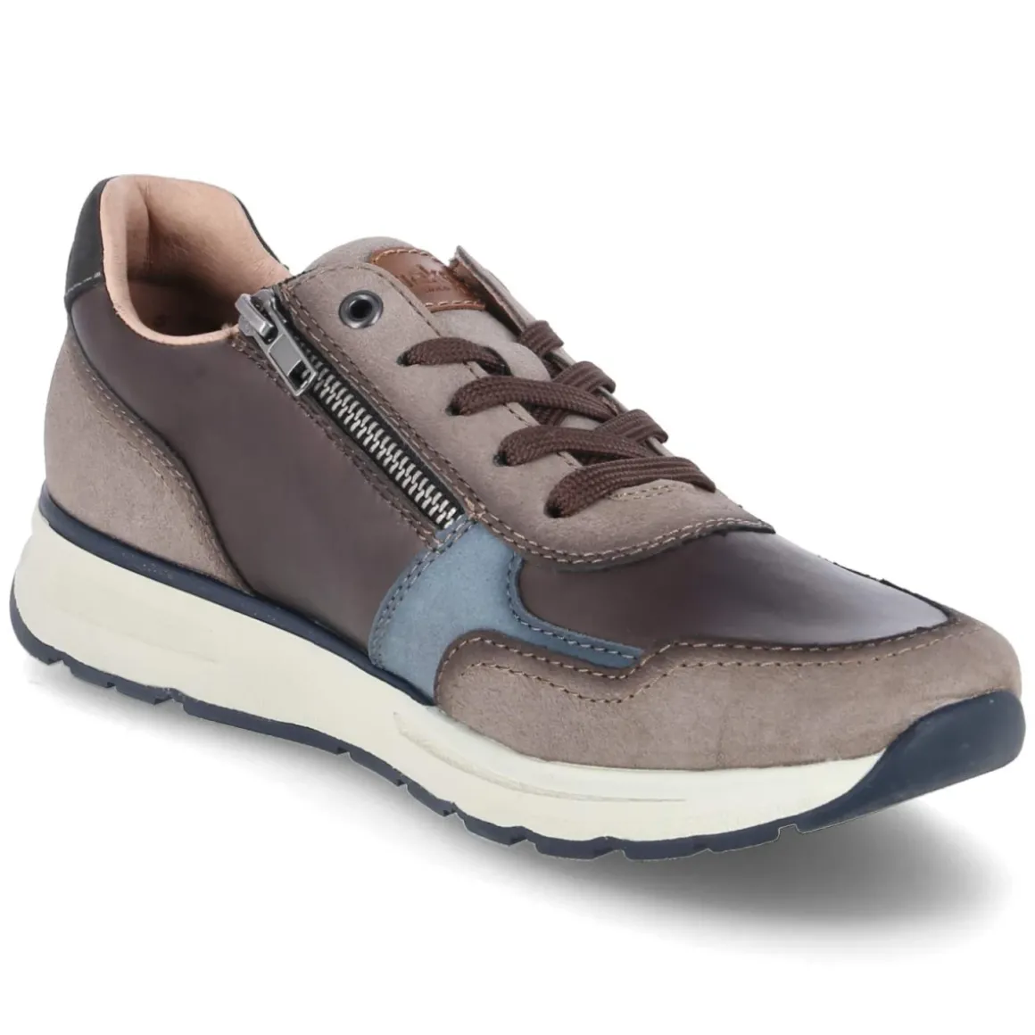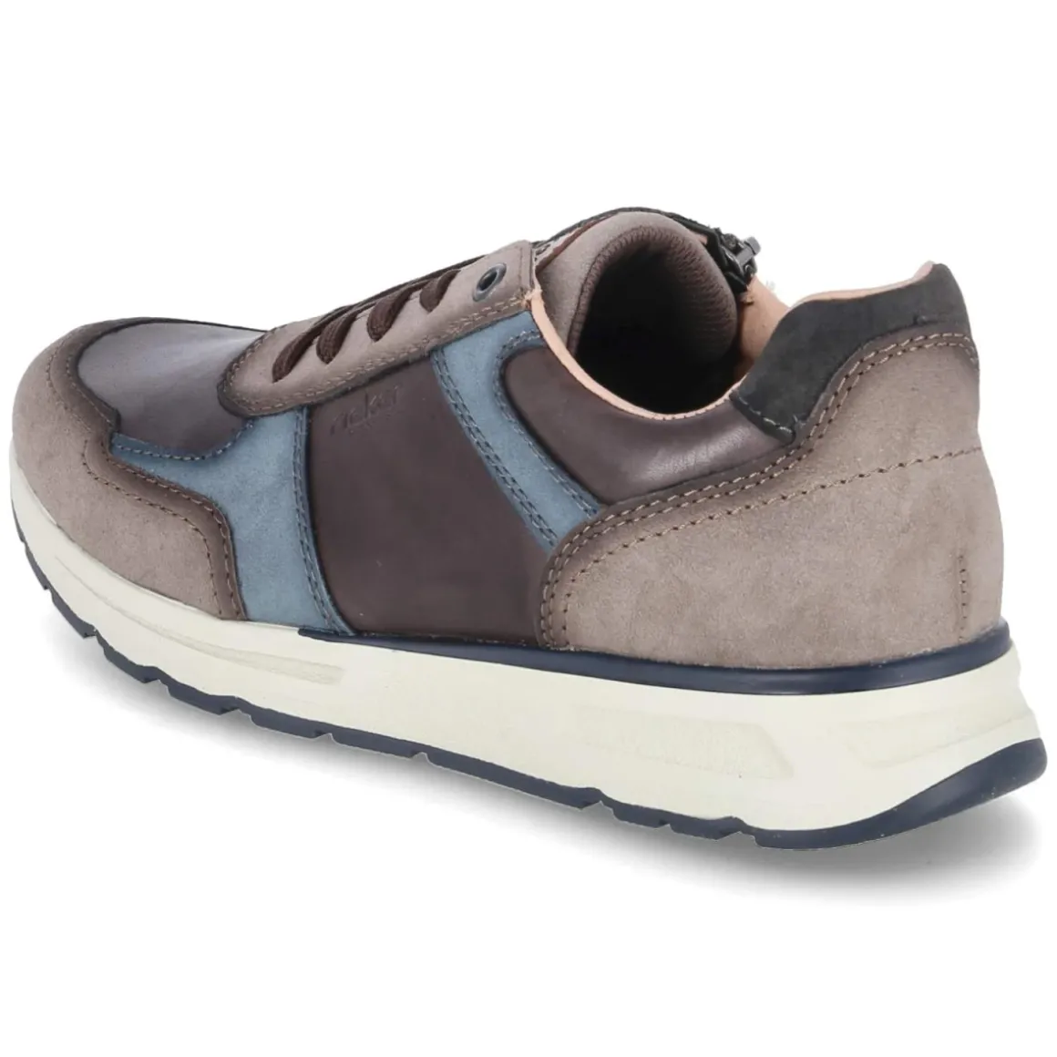 Dieser Low Sneaker von Rieker in warmem Braun verbindet sportliche Linien mit alltagstauglicher Robustheit. Der Material-Mix aus Leder und Synthetik sorgt für eine wertige Haptik und Strapazierfähigkeit, blaue Elemente setzen dezente Akzente. Die runde Schuhspitze und der gepolsterte Einstieg erhöhen den Tragekomfort, die textile Decksohle und das komfortable Wechselfußbett bieten ein angenehmes Fußklima und lassen sich bei Bedarf anpassen. Dank Schnürsenkeln und zusätzlichem Reißverschluss gelingt der Einstieg schnell, die flexible, rutschhemmende Laufsohle gibt sicheren Halt. Verstärkter Zehen- und Fersenbereich und das zurückhaltende Branding runden das Design ab. Der Größenhinweis fällt normal aus und richtet sich an Herren in der Erwachsenengröße. Modetipp: Mit dunkelblauer Chino und naturweißem Henley entsteht ein legerer Look, alternativ mit Raw Denim und Wolljacke in Navy.
