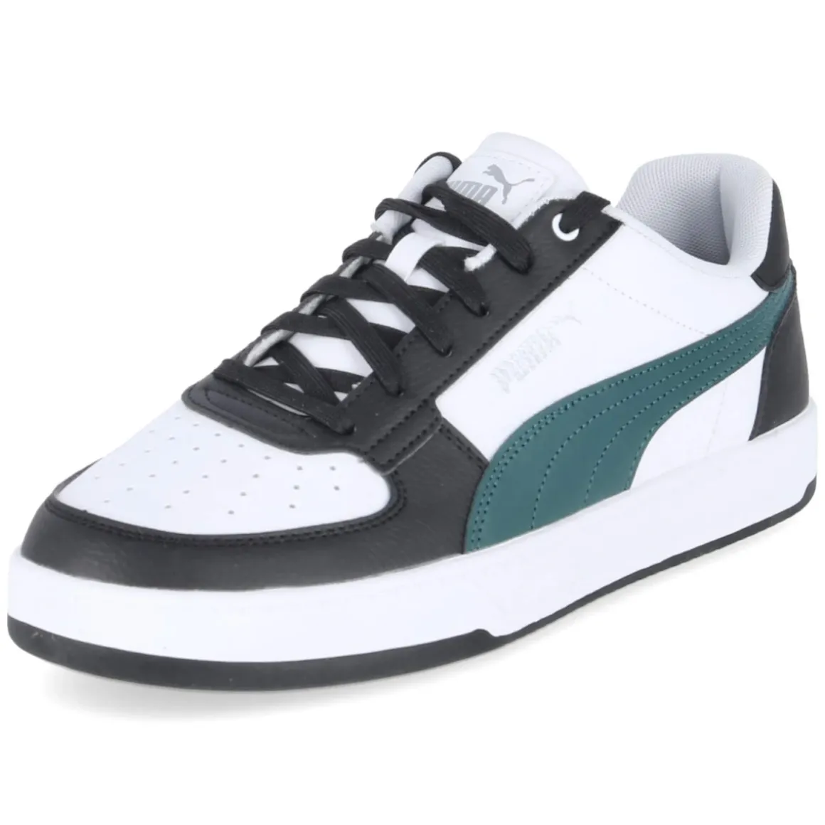 Der Low Sneaker CAVEN 2.0 von Puma verbindet cleanes Court-Design mit funktionalem Komfort. Das strahlend weiße Synthetik-Obermaterial ist besonders pflegeleicht, während der Formstrip in Dunkelgrün und silberne Markendetails sportliche Akzente setzen. Ein dezent gelochtes Schuhdeck fördert die Luftzirkulation, der gut gepolsterte Einstieg erhöht den Tragekomfort im Alltag. Verstärkte Zonen an Zehen und Ferse in Schwarz sorgen für Stabilität, die rutschfeste Laufsohle für verlässlichen Grip. Die textile Decksohle und das komfortable, herausnehmbare Wechselfußbett unterstützen ein angenehm gedämpftes Laufgefühl. Der Sneaker fällt schmaler aus und bietet dadurch eine präzisere Passform bei schlankeren Füßen. Modetipp: Mit weiter Anzughose, weißem T-Shirt und dunkelgrünem Blouson entsteht ein moderner City-Look, der die Farbe des Formstrips gekonnt aufgreift.