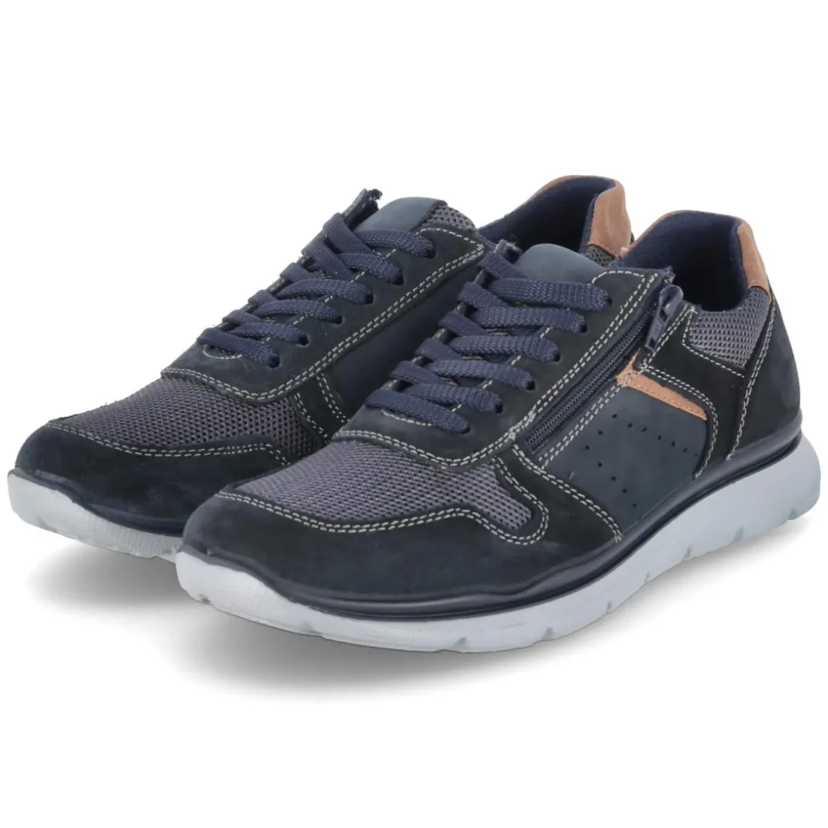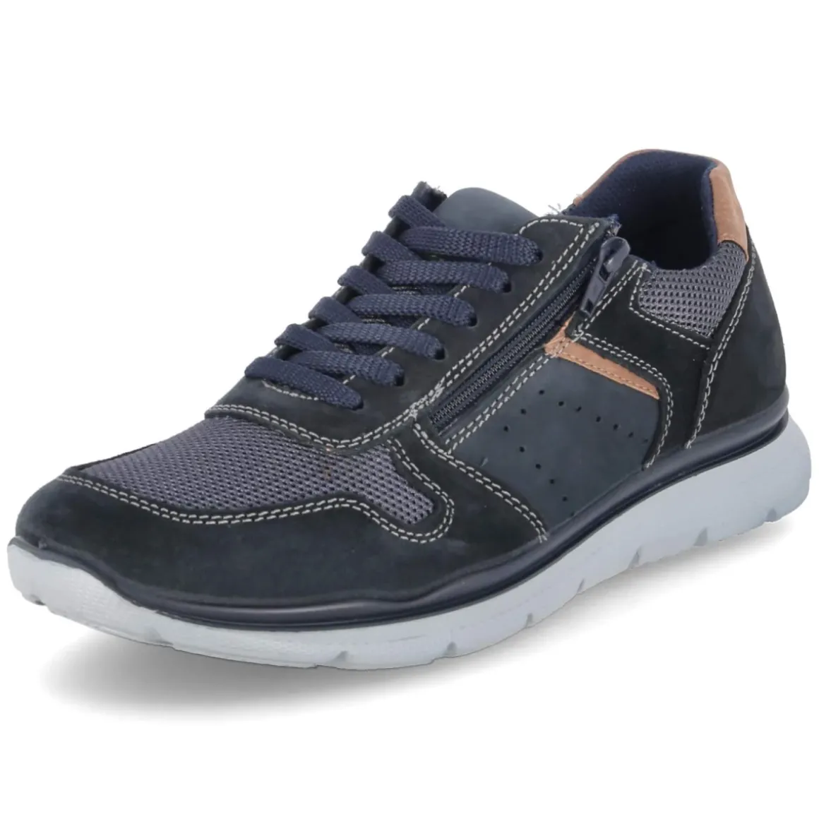 Der Low Sneaker von Beliano in sattem Dunkelblau verbindet sportliche Optik mit funktionalen Details. Das Obermaterial aus Leder und Textil sorgt für einen robusten Material-Mix, während die runde Schuhspitze und der leicht gepolsterte Einstieg ein angenehmes Tragegefühl bieten. Praktisch ist die Kombination aus Schnürsenkeln und zusätzlichem Reißverschluss, die das An- und Ausziehen erleichtert. Die hautfreundliche Lederdecksohle und das gepolsterte Wechselfußbett mit Lederbezug schaffen Komfort auf langen Wegen. Verstärkte Zehen- und Fersenbereiche erhöhen die Stabilität, die flexible, rutschhemmende Laufsohle mit Shockabsorber in der Ferse federt Schritte zuverlässig ab. Der Schnitt fällt normal aus und richtet sich an erwachsene Herren, die Wert auf Komfort legen. Modetipp: Mit Chinos in Graunuancen und einem leichten Strickpullover entsteht ein smarter Casual-Look, der die dunkle Blau-Nuance elegant aufgreift.