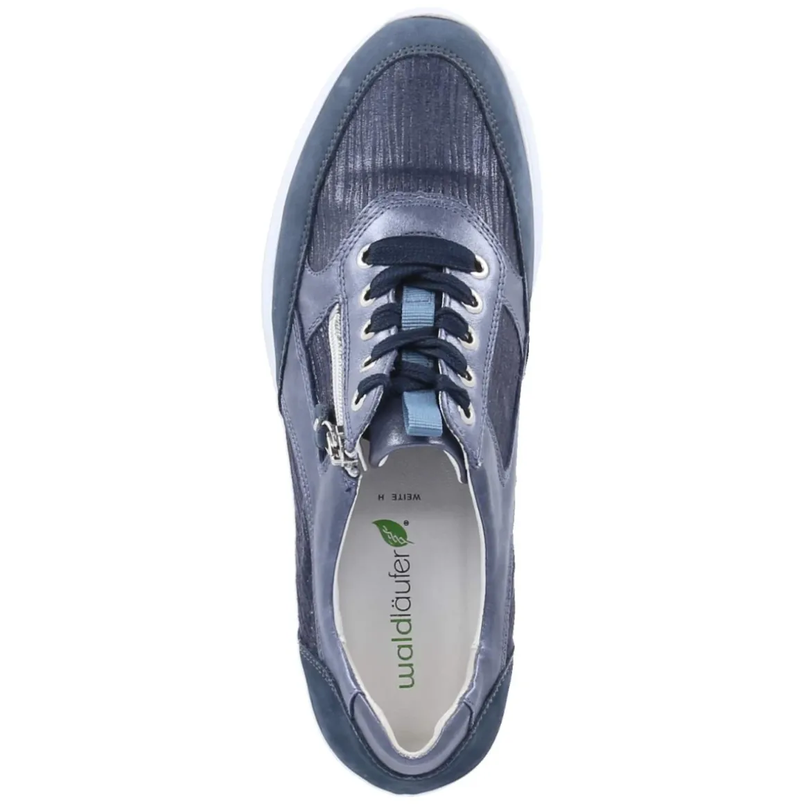 Der Low Sneaker HIMONA von Waldläufer verbindet sportliche Lässigkeit mit durchdachtem Komfort. Das frische Blau erhält durch metallisch glänzende Partien und dezente Streifen einen modernen Akzent, der sowohl zu Casual-Looks als auch zu smarten Freizeit-Outfits passt. Obermaterial und Decksohle aus hochwertigem Echtleder stehen für Langlebigkeit und ein angenehmes Fußklima. Die runde Spitze, der leicht gepolsterte Einstieg sowie die gepolsterte, lederbezogene Wechseldecksohle unterstützen entspanntes Gehen über den ganzen Tag. Für eine individuelle Passform sorgt die Schnürung, während der zusätzliche Reißverschluss das An- und Ausziehen erleichtert. Verstärkte Zehen- und Fersenbereiche geben Stabilität, die flexible, rutschhemmende Profilsohle bietet sicheren Halt. Fällt normal aus und eignet sich für Damen, die Wert auf Komfort legen. Modetipp: Mit Cropped-Jeans, weißem Shirt und silberfarbenen Accessoires entsteht ein cleaner City-Look.