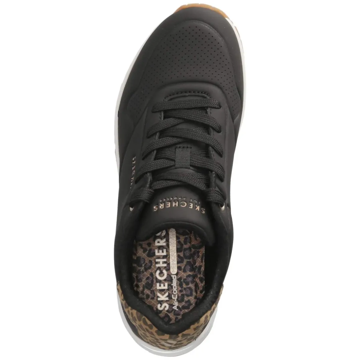Der Low Sneaker JUNGLE NITE von Skechers verbindet urbane Lässigkeit mit sportivem Komfort. Schwarzes Synthetik-Obermaterial trifft auf akzentuierenden Leopardenprint, perforierte Partien und fein gesetzte Markendetails. Die runde Spitze und der gepolsterte Einstieg sorgen zusammen mit der verstärkten Ferse für ein angenehmes Tragegefühl und zuverlässigen Halt im Alltag. Das weich dämpfende Memory-Foam-Fußbett passt sich der Fußform an und bietet lang anhaltende Bequemlichkeit, während die flexible, rutschhemmende Laufsohle souveräne Traktion auf verschiedenem Untergrund liefert. Durch die Schnürung lässt sich die Passform individuell justieren; das Modell fällt größengetreu aus. Ein vielseitiger Begleiter für Arbeit, Freizeit und City-Nights. Modetipp: Zu Cropped-Jeans, Satinbluse und Lederjacke entsteht ein kontrastreicher Look, der den Leo-Print elegant in Szene setzt.