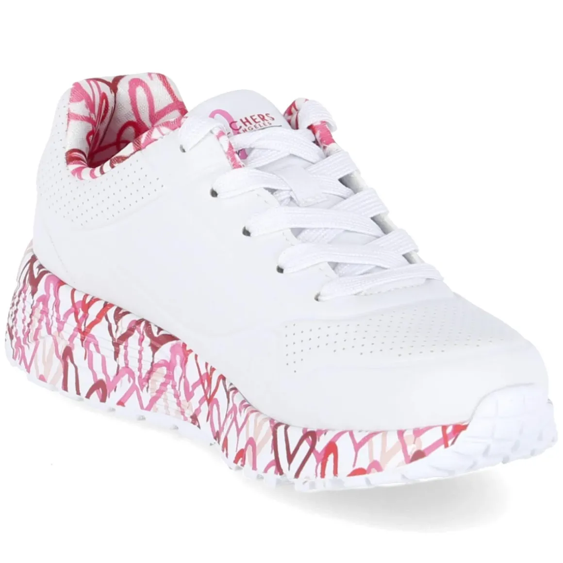 Der Low Sneaker LOVELY LUV von Skechers verbindet spielerischen Look mit hohem Tragekomfort. Das weiße Synthetik-Obermaterial zeigt sich pflegeleicht und bleibt dank feiner Lochungen am Schuhdeck angenehm luftig. Die runde Spitze und die gepolsterte Einstiegszone geben viel Bewegungsfreiheit, während die Schnürung sicheren Halt bietet. Das Air-Cooled Memory Foam Fußbett passt sich weich an und entlastet Kinderfüße auch an langen Tagen. Die textile Decksohle unterstützt das angenehme Klima im Schuh. Eine weiße, flexible, rutschhemmende Laufsohle sorgt für Grip auf wechselnden Untergründen, das relaxt leichte Design für unbeschwertes Tragen. Ein verspielter, rosa Herzprint am Sohlenrahmen und Einstieg setzt einen frischen Akzent. Fällt größengetreu aus. Modetipp: zu Pastell-Jogger und Ringelshirt oder zu Denim-Shorts mit bunten Söckchen.