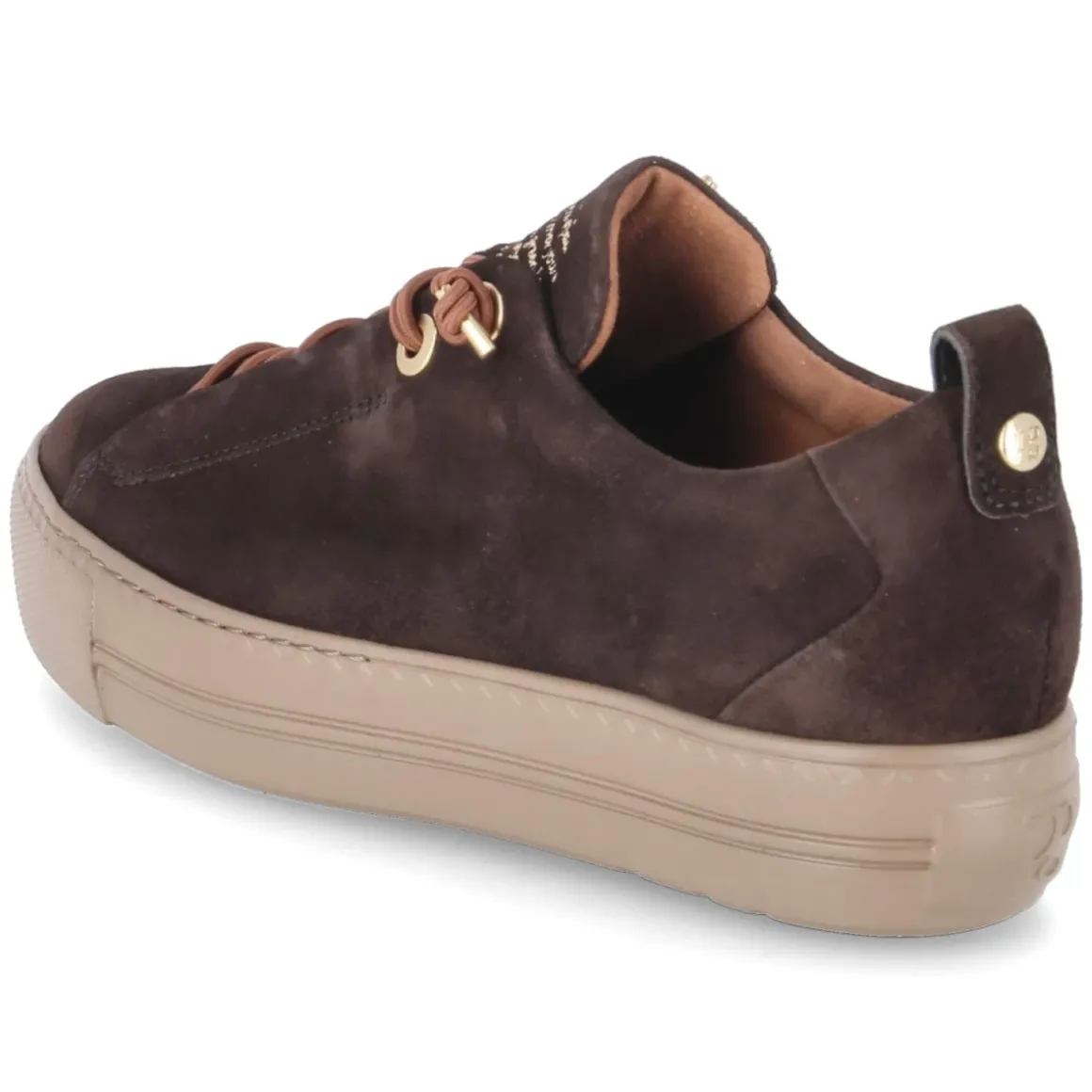 Der Low Sneaker von Paul Green präsentiert sich in tiefem Braun mit edlen goldenen Details und einer weich schimmernden Raulederoberfläche. Die runde Spitze und die verstärkte Ferse sorgen für eine feminine, zugleich robuste Silhouette, während die bequeme Elastikschnürung den Schnürsenkel-Look modern interpretiert und sicheren Halt bietet. Innen verwöhnt eine Decksohle aus Leder, außen trägt eine rutschhemmende Laufsohle mit markanter Cupsohle und schützenden Bumpern durch den Tag. Das 3 cm hohe Plateau verleiht dezent Höhe, ohne auf Komfort zu verzichten. Der Sneaker fällt normal aus und passt sich dem Fuß angenehm an – ein vielseitiger Begleiter für Damen mit Sinn für Qualität und Lässigkeit. Modetipp: Mit dunkel gewaschener Denim, feinem Strick in Creme und einem camelfarbenen Mantel entsteht ein mühelos eleganter City-Look.