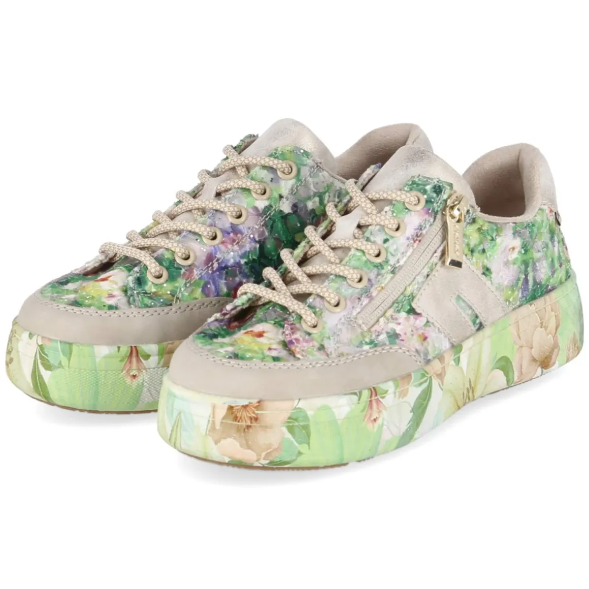 Der Low Sneaker von Rieker für Damen verbindet modernen Material-Mix aus Textil und Synthetik mit einem ausdrucksstarken Look. Die strukturierte Oberfläche trägt einen mehrfarbigen Blumen-Aquarell-Print, feinen Glitzer und goldene Details, während der verstärkte Zehenbereich die Alltagstauglichkeit erhöht. Dank rundem Leisten, komfortablem Wechselfußbett mit Textil-Decksohle und einer rutschfesten Laufsohle gelingen lange Tage entspannt. Schnürsenkel sorgen für variablen Halt, der zusätzliche Reißverschluss für bequemen Einstieg. Der 4 cm hohe Plateau-Absatz setzt einen leichten Lift, ohne die Stabilität zu mindern. Das Muster wirkt lebendig und bleibt durch die gedeckten Goldakzente elegant. Größenhinweis: fällt normal aus. Modetipp: Besonders stimmig wirkt das Modell zu cropped Jeans in Mid-Blue und einer leichten Bluse; ein goldener Armreif greift die Details auf und rundet das Ensemble harmonisch ab.