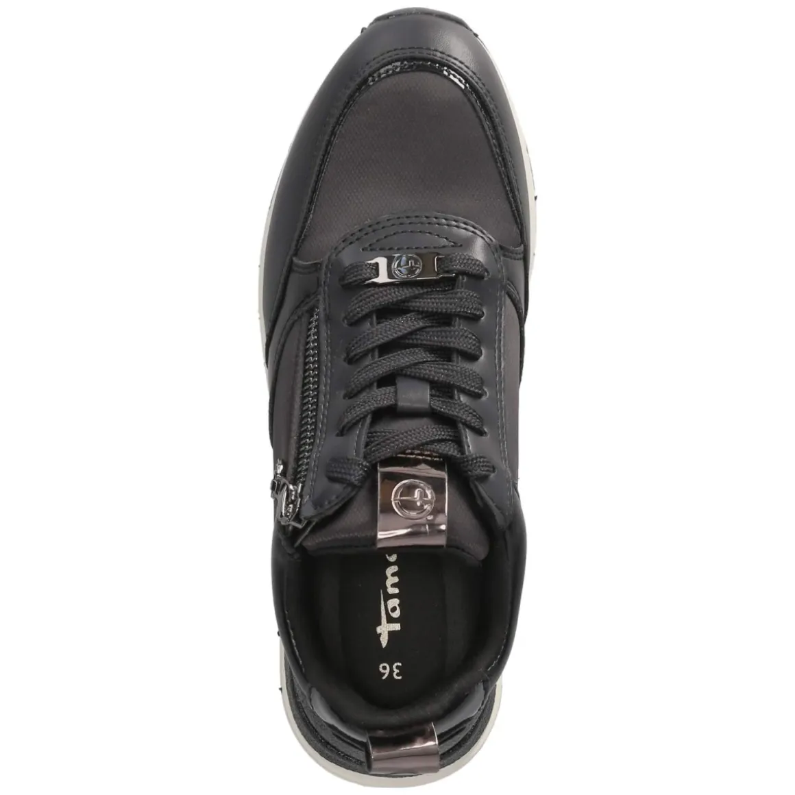 Der Low Sneaker von Tamaris setzt auf eine klare, moderne Silhouette mit runder Spitze und harmonischem Blauton, der je nach Licht fast Schwarz wirken kann. Das Obermaterial aus Textil und Synthetik wird durch eine verstärkte Ferse mit schimmernder Oberfläche und feinen metallischen Akzenten veredelt. Vegane Materialien unterstreichen den zeitgemäßen Anspruch. Für Alltagstauglichkeit sorgen ein angenehm gepolsterter Einstieg, Schnürsenkel in Kombination mit zusätzlichem Reißverschluss sowie eine flexible, rutschfeste Laufsohle. Die gepolsterte, herausnehmbare Decksohle ermöglicht individuelle Anpassung, während der Schnitt normal ausfällt und sofort vertrauten Tragekomfort bietet. Markendetails setzen dezente Highlights und betonen die feminine Low-Silhouette für Erwachsene. Modetipp: Besonders stimmig wirkt der Sneaker zu cropped Straight-Jeans und einem feinen Stricktop; ein nachtblaue Trenchcoat rundet den monochromen Look elegant ab.