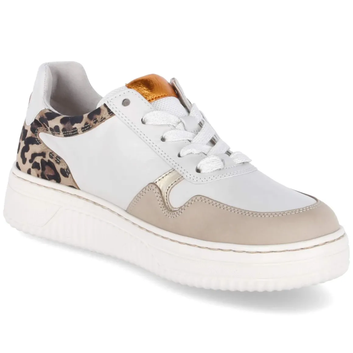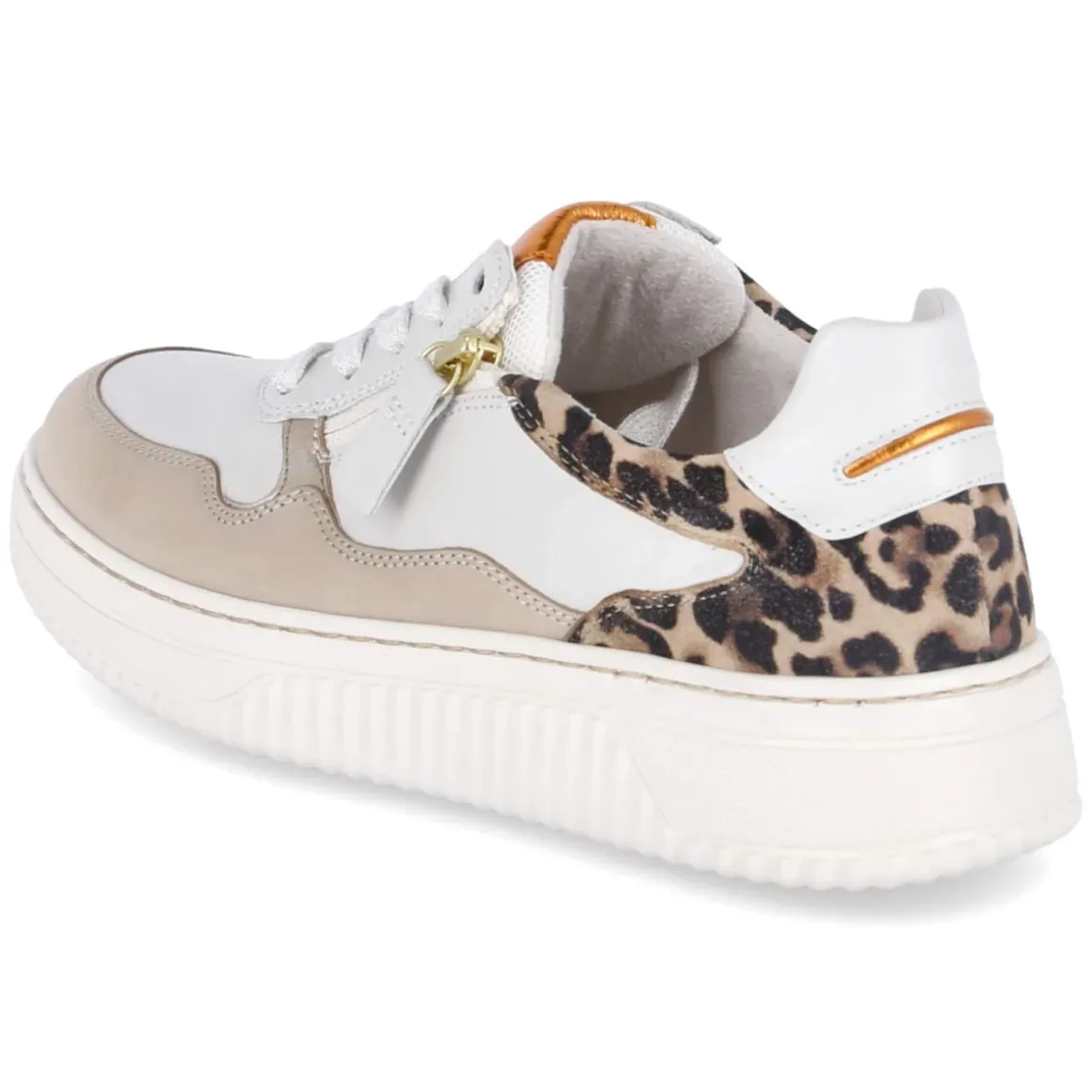 Der Low Sneaker von Gabor in Beige verbindet lässige Sportlichkeit mit femininen Akzenten. Ein stilvoller Ledermix prägt das Obermaterial, metallisch glänzende Highlights und eine Ferse im dezenten Leopardmuster setzen moderne Kontraste. Die runde Schuhspitze und der verstärkte Fersen- und Zehenbereich sorgen für ein angenehmes Tragegefühl, während die rutschhemmende Laufsohle sicheren Halt vermittelt. Schnürsenkel in Kombination mit seitlichem Reißverschluss erleichtern das An- und Ausziehen. Das gepolsterte Lederfußbett ist herausnehmbar und macht Platz für eigene Einlagen; in der Länge fällt das Modell normal aus, bietet dank Weite K jedoch mehr Spielraum. Das relaxt leichte Tragegefühl begleitet durch lange Tage. Modetipp: Besonders harmonisch wirkt der Sneaker zu hellen Denim-Tönen und einem sandfarbenen Trench, die das Beige und den Animal-Print subtil aufnehmen.