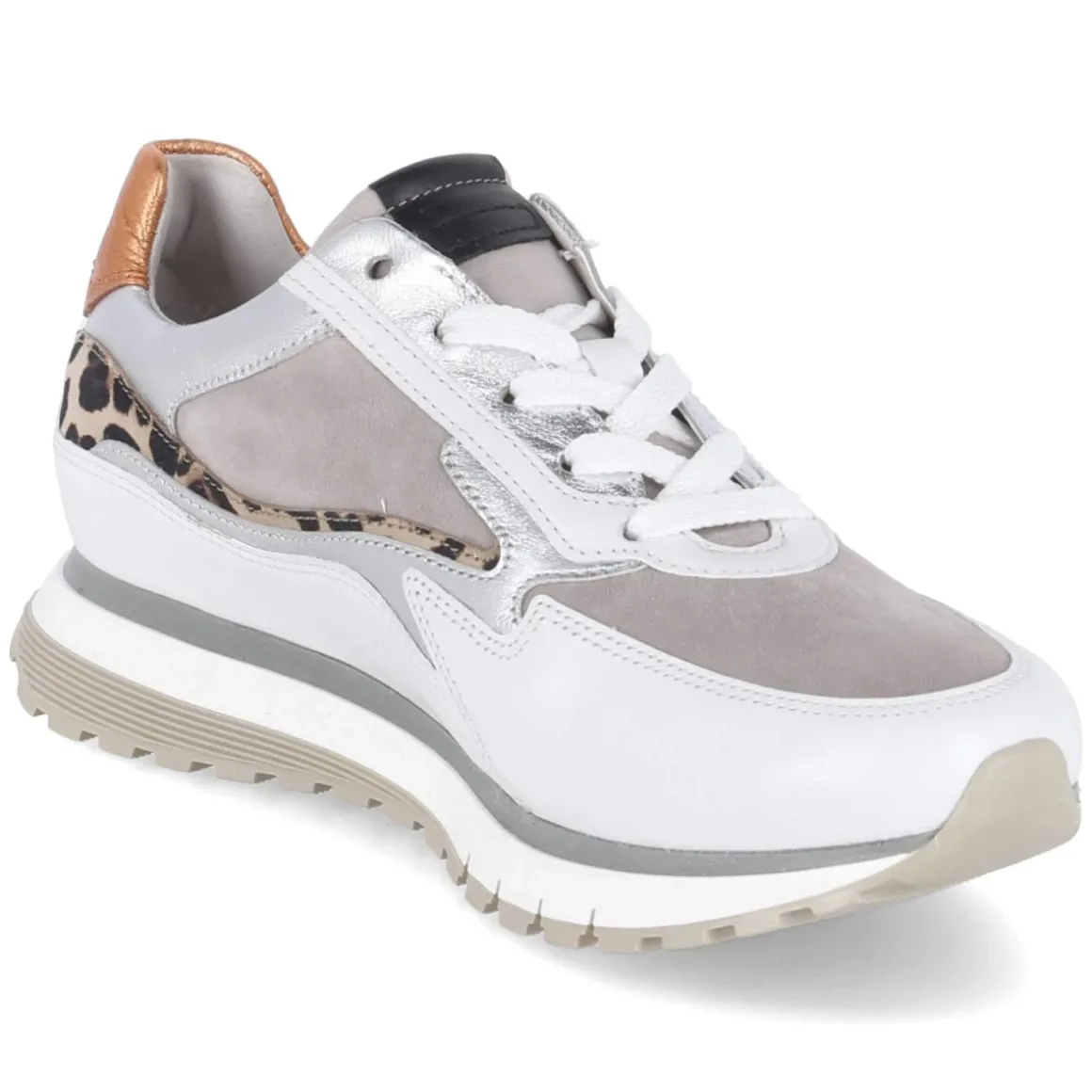 Der Low Sneaker von Gabor verknüpft puristische Linien mit durchdachter Funktion. Das weiße Obermaterial aus langlebigem Echtleder zeigt sich weich und formstabil, die runde Spitze ergänzt die zeitlose Silhouette. Ein gepolsterter Einstieg und ein komfortables, herausnehmbares Fußbett sorgen für angenehme Dämpfung, während der verstärkte Zehen- und Fersenbereich zusätzliche Stabilität bringt. Dezente Label-Details treffen auf Zierstreifen in Silber und Leopardenmuster, die der modernen Optik einen subtilen Twist verleihen. Dank rutschhemmender Laufsohle bleibt der Auftritt sicher, die Passform fällt normal aus und lässt Raum für eigene Einlagen. Klassische Schnürung ermöglicht präzisen Halt von morgens bis abends. Modetipp: Den cleanen Look mit Cropped-Jeans, weißem T‑Shirt und einem leichten Trench kombinieren; ein Accessoire mit Animal-Detail greift den Streifen elegant auf.