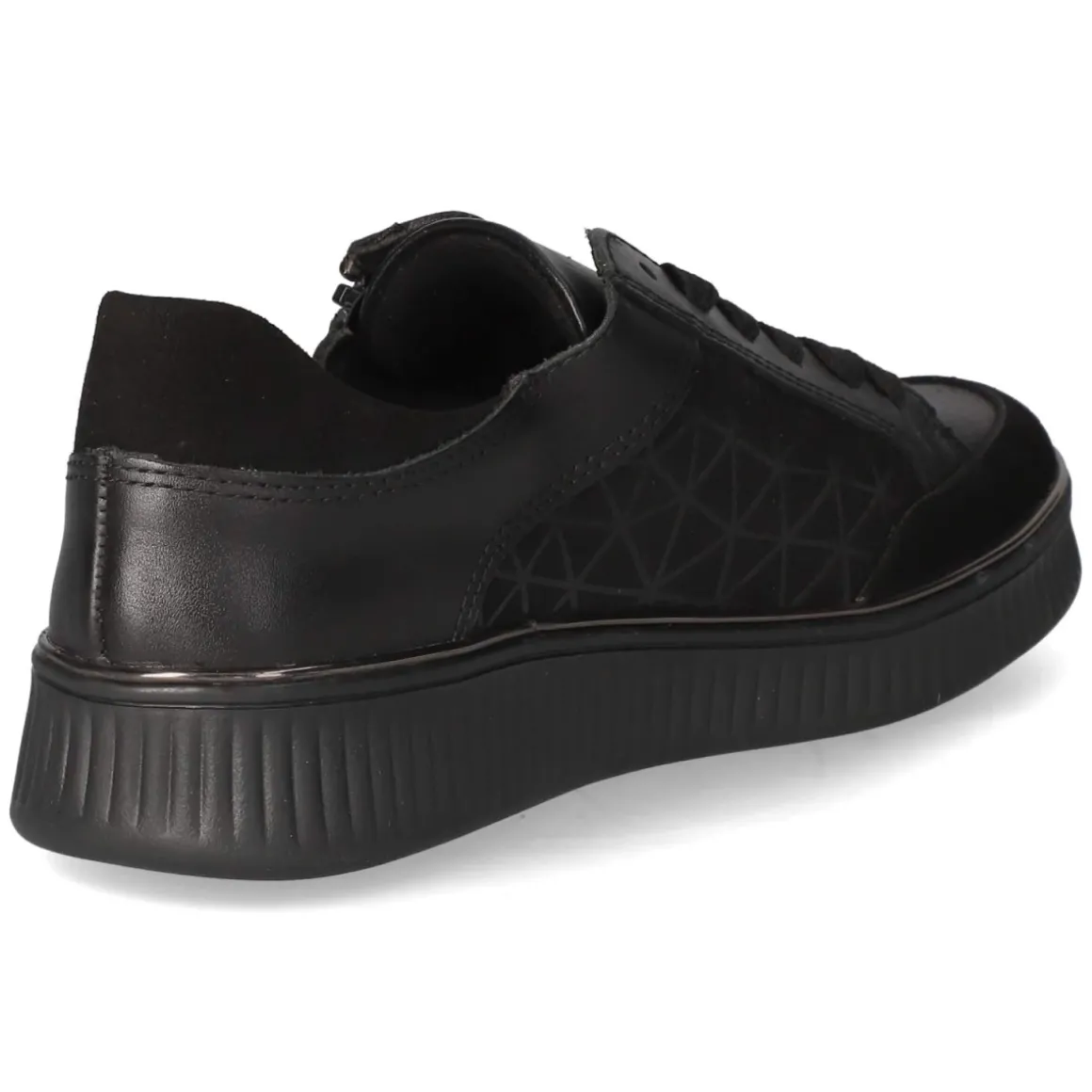 Der Low Sneaker von Remonte verbindet urbanen Chic mit funktionaler Bequemlichkeit. Schwarzes Glattleder aus atmungsaktivem Echtleder legt sich weich an und wird durch verstärkte Zonen aus Rauleder an Zehen und Ferse robust ergänzt. Schnürung und zusätzlicher Reißverschluss ermöglichen einen schnellen Einstieg und eine passgenaue Weitenregulierung. Der rund gearbeitete Leisten, ein bequem gepolsterter Einstieg sowie die gepolsterte, herausnehmbare Textil-Decksohle sorgen für langanhaltenden Komfort. Optisch setzen geometrische Partien und der platinfarbene Schuhrahmen moderne Akzente, während die flexible, rutschhemmende Laufsohle sicheren Grip bietet. Der Größenhinweis fällt kleiner aus, daher wird eine Nummer größer empfohlen. Modetipp: Zu Cropped-Jeans und einem cleanen Blazer entfaltet der metallische Rahmen seine Wirkung; silberne Accessoires greifen die Nuance elegant auf.