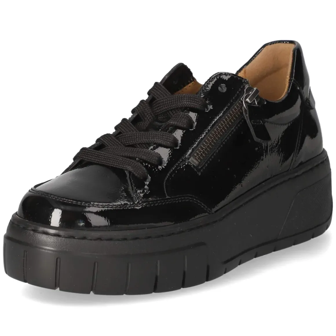 Der Gabor Low Sneaker für Damen verbindet eine elegante Lackoptik in tiefem Schwarz mit alltäglicher Funktionalität. Das Obermaterial aus glänzendem Lackleder verleiht dem minimalistischen Low-Design einen edlen Akzent, während die runde Schuhspitze für eine harmonische Silhouette sorgt. Schnürsenkel garantieren individuelle Anpassung, ein zusätzlicher seitlicher Reißverschluss erleichtert das An- und Ausziehen. Das komfortable Wechselfußbett lässt sich bei Bedarf gegen eigene Einlagen tauschen, die Decksohle aus Textil unterstützt ein angenehmes Fußklima. Verstärkter Zehen- und Fersenbereich geben Stabilität, die rutschhemmende Laufsohle sorgt für sicheren Halt im urbanen Alltag. Der Schuh fällt normal aus und überzeugt als vielseitiger Begleiter vom Office bis zum After-Work. Modetipp: Zu Cropped-Jeans und Oversize-Blazer entsteht ein moderner Kontrast, abends wirkt ein Satinkleid in gedeckten Tönen besonders stimmig.