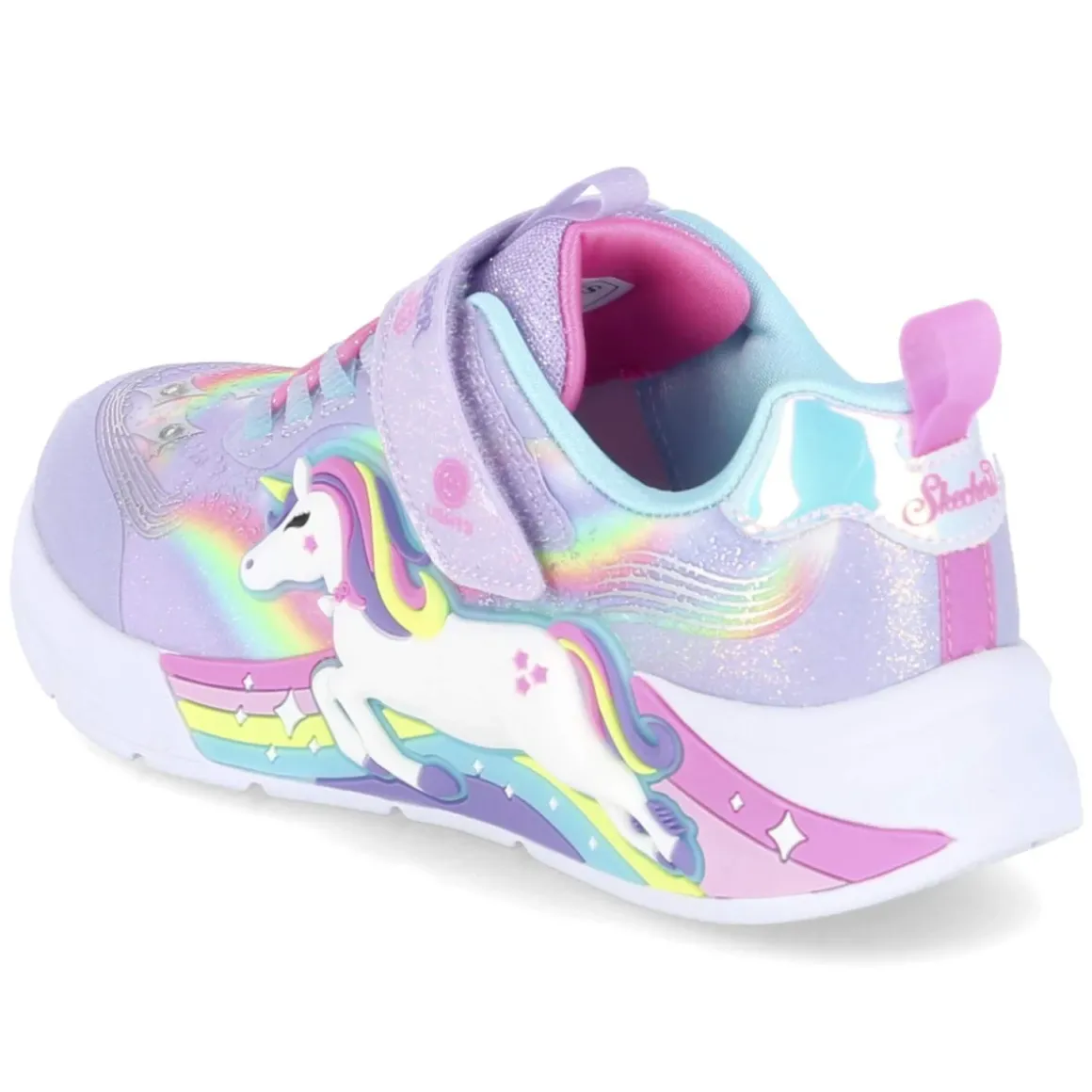 Der Skechers Low Sneaker UNICORN CHASER bringt mit lila Glanz und fantasievollen Details magische Energie in den Alltag. Das glitzernde Obermaterial aus Textil zeigt einen Regenbogenprint und ein seitliches Einhorn, dazu blitzen schaltbare LEDs in der Sohle bei jedem Schritt. Der bequeme Klettverschluss erleichtert das An- und Ausziehen, während gepolsterter Einstieg und weich gepolstertes Fußbett für Komfort sorgen. Die runde Spitze, der moderne Material-Mix sowie verstärkte Zehen- und Fersenbereiche bieten kindgerechten Halt. Eine flexible, rutschhemmende non-marking Laufsohle macht den Schuh hallentauglich. Die Passform fällt normal aus und das gelabelte Design überzeugt auf dem Schulhof ebenso wie beim Spielen. Modetipp: Zu Jeans in Pastelltönen, kuscheligem Hoodie und glitzernden Socken kombinieren – ein Rucksack mit Regenbogendetails rundet den Look ab.