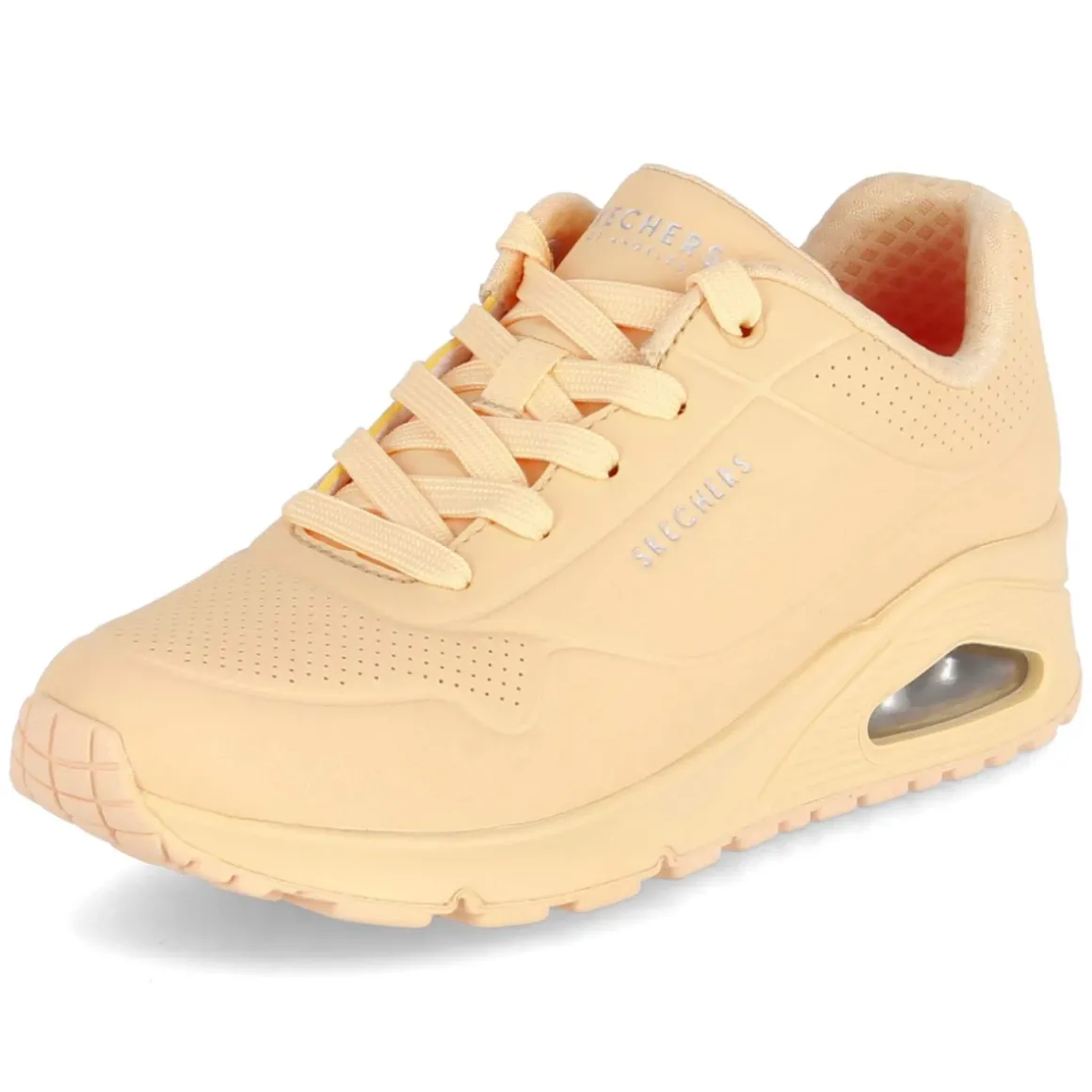 Der Skechers Low Sneaker UNO STAND ON AIR zeigt eine moderne Silhouette in sattem Orange und setzt mit dynamischen Prägungen sowie markanten Markendetails klare Statements. Das pflegeleichte Synthetik-Obermaterial überzeugt im Alltag, während die runde Schuhspitze und der gepolsterte Einstieg für ein angenehmes Tragegefühl sorgen. Die beste Memory-Foam-Fußbettung passt sich dem Fuß an und harmoniert mit der textilen Decksohle zu spürbarer Weichheit. Stabilität schaffen der verstärkte Zehen- und Fersenbereich, die rutschhemmende Profilsohle und das Sichtfenster in der Ferse, das die dämpfende Technologie unterstreicht. Der Schnürverschluss ermöglicht eine verlässliche Passform, die normal ausfällt und damit unkompliziert tragbar ist. Modetipp: Besonders stimmig wirkt der Sneaker zu heller Cropped-Denim und einer sportiven Bomberjacke; ein Feinstrick-Top in Offwhite greift die frischen Akzente elegant auf.