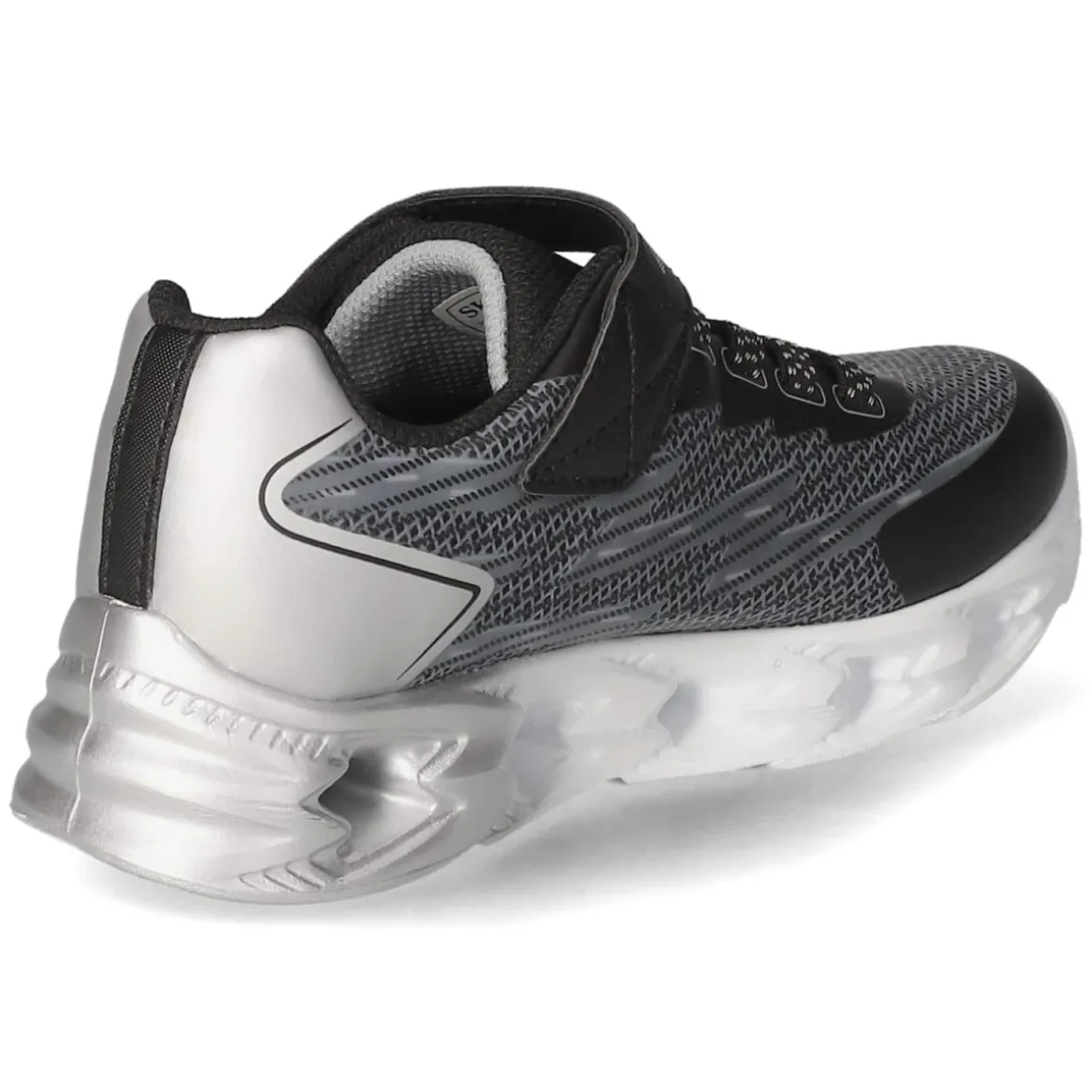 Der Skechers Low Sneaker VORTEX 2.0 bringt Bewegung ins Spiel: Das robuste Synthetik-Obermaterial sorgt gemeinsam mit der verstärkten Ferse für Formstabilität, während der leicht gepolsterte Einstieg und die textile, weich gepolsterte Decksohle hohen Tragekomfort sichern. Elastikschnürung und bequemer Klettverschluss ermöglichen einen schnellen, sicheren Halt – ideal, da der Schuh normal ausfällt. Highlight sind die blinkenden LEDs in der Sohle, die über einen praktischen On/Off-Schalter gesteuert werden können. Die flexible, rutschhemmende NON-MARKING Laufsohle hinterlässt keine Spuren und bietet zuverlässigen Grip in Schule, Kita und Halle. Markendetails und die runde Schuhspitze runden das Design in klassischem Schwarz ab. Modetipp: Zu dunklen Slim-Jeans, farbigen Sportsocken und einer leichten Bomberjacke kommt der LED-Effekt besonders gut zur Geltung.