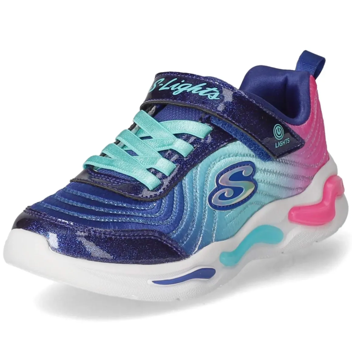 Der Low Sneaker WAVY BEAMS von Skechers setzt in leuchtendem Blau ein funkelndes Statement am Kinderfuß. Das Obermaterial aus Textil und Synthetik zeigt ein Wellenmuster mit Glitzer, ergänzt durch Teile in Lackoptik, während eine elegant schimmernde Oberfläche für einen besonders edlen Look sorgt. Der runde Zuschnitt bietet Zehenfreiheit, ein bequemes Fersenpolster sowie ein weich gepolstertes Fußbett und ein leicht gepolsterter Einstieg erhöhen den Tragekomfort im Alltag. Dank Klettverschluss mit praktischer Anziehlasche ist schnelles Reinschlüpfen problemlos, die blinkenden LEDs lassen sich per On/Off-Funktion steuern. Die flexible Non-Marking Laufsohle schont Hallenböden und gibt verlässlichen Grip, die Textil-Decksohle sorgt für angenehmes Fußklima. Mit Markendetails abgerundet und in der Größe normal ausfallend, passt der Sneaker unkompliziert. Modetipp: Zu Denim-Shorts oder Jeans, sportlichem Hoodie und farblich passenden Socken wird der Look zum strahlenden Lieblingsoutfit.