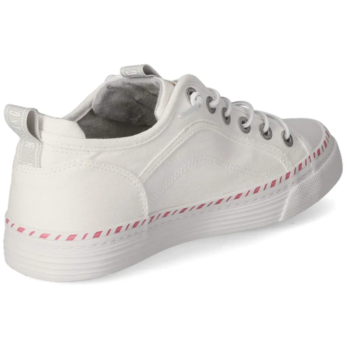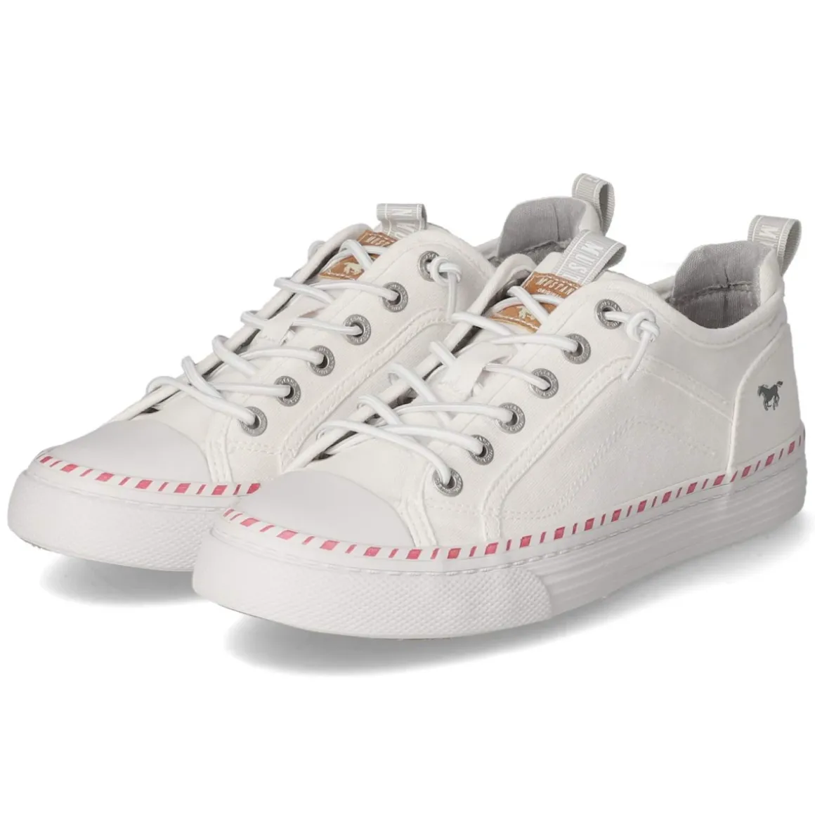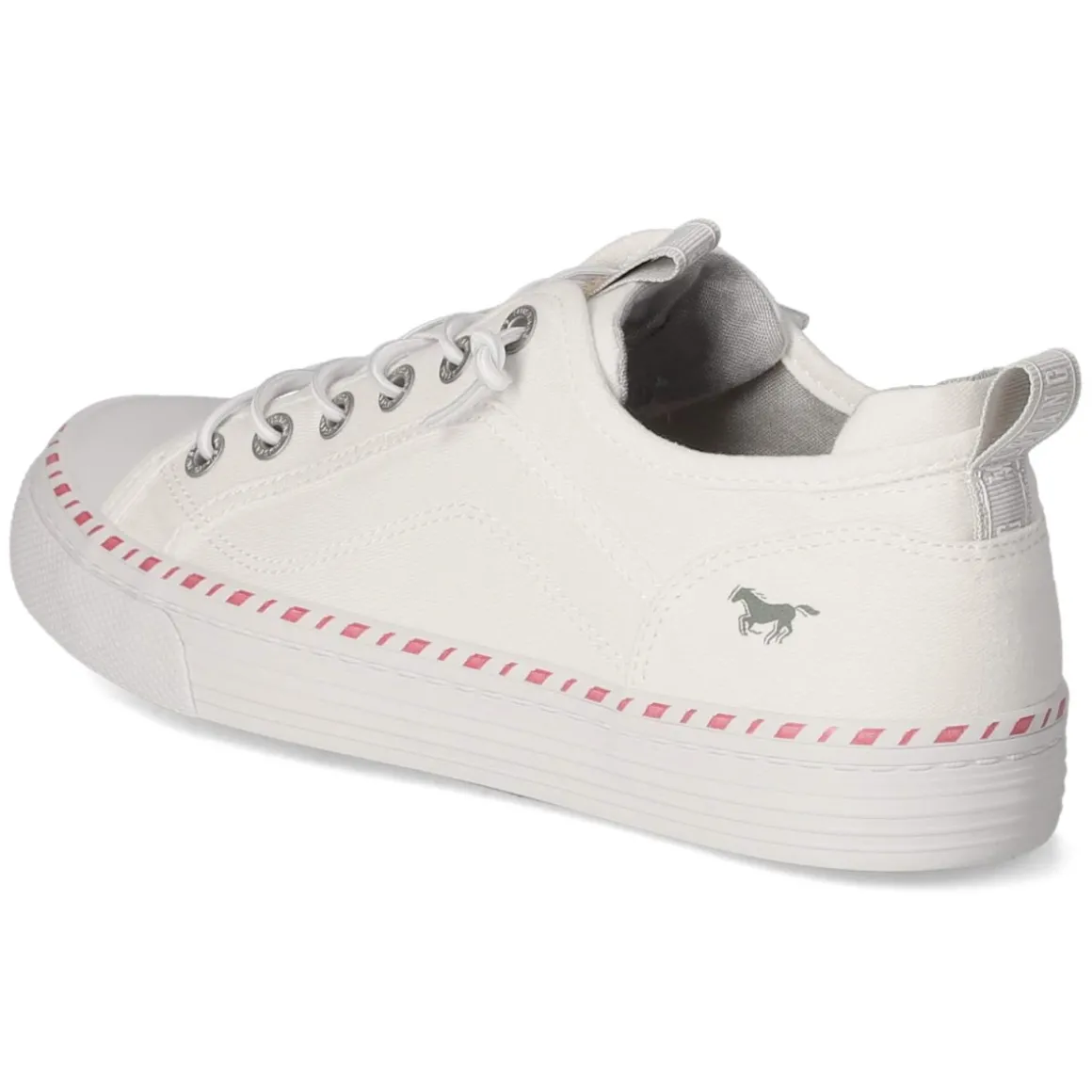 Der weiße Low Sneaker von Mustang verbindet lässige Optik mit hohem Tragekomfort. Das textile Obermaterial mit griffiger Haptik und runder Spitze wirkt clean, während weiße Ziernähte und dezente Markendetails das Design veredeln. Schnürung und ein kleiner Elastikeinsatz am Spann erleichtern den Einstieg, zusätzlich unterstützt von Anziehlasche und gepolsterter Ferse. Das weich gepolsterte Fußbett sorgt für angenehme Dämpfung im Alltag. Zehen- und Fersenbereich sind verstärkt, die flexible, rutschhemmende Cupsohle bietet zuverlässigen Halt auf verschiedenen Untergründen. Dank normaler Passform fällt das Modell größengetreu aus und eignet sich ideal für erwachsene Trägerinnen. Modetipp: Für einen frischen City-Look den Sneaker zu Cropped-Jeans, gestreiftem Shirt und leichtem Trench kombinieren – weiße Accessoires greifen den Ton auf und lassen das Outfit besonders modern wirken.