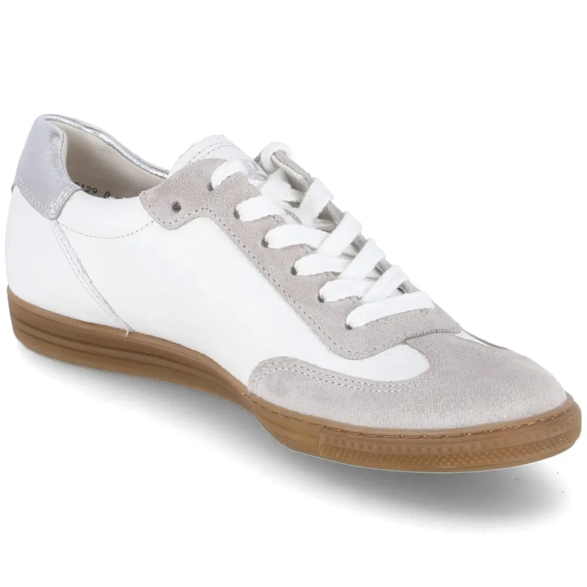 Der Low Sneaker von Paul Green vereint zeitlose Klarheit mit moderner Retro-Optik. Das weiße Echtleder zeigt eine besonders langlebige Qualität, die durch den verstärkten Zehen- und Fersenbereich zusätzlich geschützt wird. Eine silberne Fersenklappe setzt einen dezenten Glanzakzent und unterstreicht das gelabelte Design. Für Komfort sorgen die hautfreundliche Lederdecksohle und das weich gepolsterte Lederfußbett. Die runde Spitze und die klassische Schnürung bieten eine angenehme Passform, die regulär ausfällt, während die flexible, rutschhemmende Laufsohle verlässlichen Grip im Alltag liefert. Der niedrige Schnitt trägt sich leicht und vielseitig – vom City-Look bis zum Office Casual. Modetipp: Zu locker sitzender Mom-Jeans, cleanem Weißshirt und einem grauen Blazer entsteht ein lässig-eleganter Kontrast; fein gerippte Strümpfe in Off-White greifen die Helligkeit des Schuhs effektvoll auf.