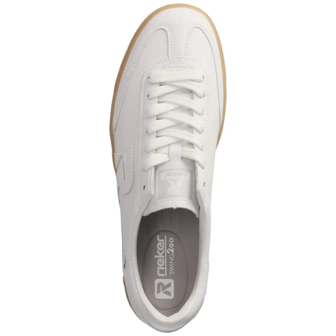 Der weiße Low Sneaker von Rieker verbindet zeitloses Design mit funktionalen Details. Glattes Echtleder sorgt für eine wertige Optik und macht das Modell besonders robust, während die runde Schuhspitze genügend Zehenfreiheit bietet. Der gepolsterte Einstieg und die gelabelten Akzente unterstreichen den sportiven Look. Dank vorgeformtem, angenehm gepolstertem Wechselfußbett mit Textildecksohle bleibt das Tragegefühl auch an langen Tagen entspannt; bei Bedarf lässt sich die Einlage für eigene Einlagen schnell austauschen. Die Schnürung ermöglicht eine fein justierbare Passform, die Cupsohle ist flexibel und rutschhemmend, Zehen- und Fersenbereich sind zusätzlich verstärkt. Als relaxtes Leichtgewicht fällt der Sneaker normal aus und begleitet souverän durch Alltag und Reise. Modetipp: Zu Cropped-Jeans und Trenchcoat kommt das klare Weiß besonders gut zur Geltung, Ton-in-Ton mit hellen Socken wirkt der Look extra frisch.