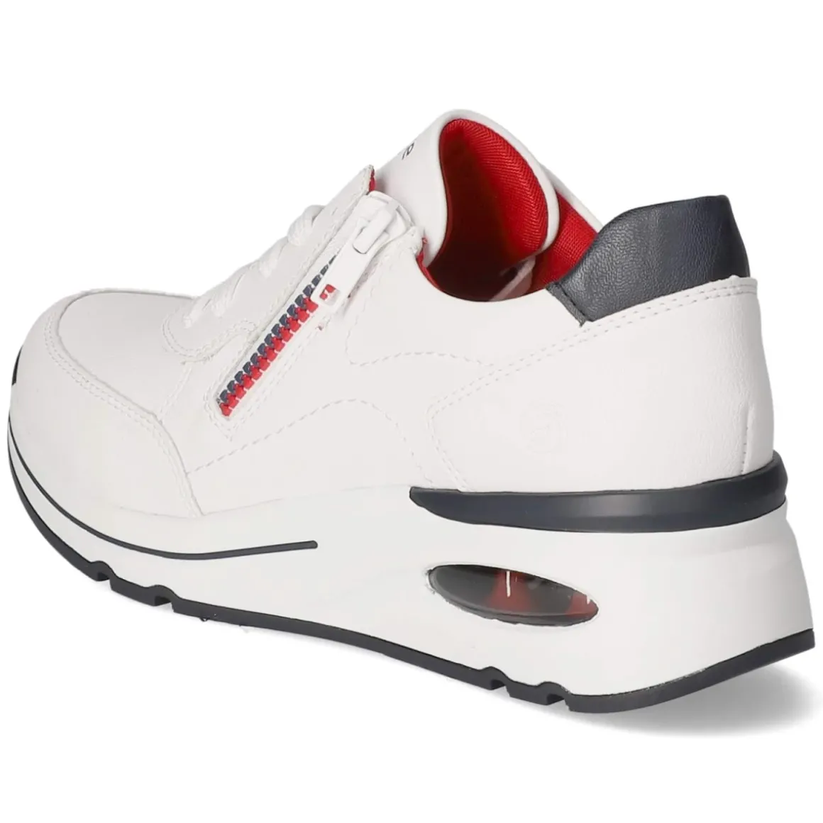 Remonte interpretiert den klassischen Low Sneaker in strahlendem Weiß mit feinen roten und dunkelblauen Akzenten modern und maritim. Das Obermaterial aus Glattleder punktet mit pflegeleichter Oberfläche, die runde Schuhspitze sowie der verstärkte Zehen- und Fersenbereich sorgen für eine harmonische, schützende Form. Für Komfort stehen gepolsterter Einstieg und gepolsterte Wechseldecksohle, das komfortable Wechselfußbett lässt sich mühelos austauschen. Eine textile Decksohle und die flexible, rutschhemmende Laufsohle mit Sichtfenster begleiten leicht und sicher durch den Tag. Der Mix aus Schnürsenkeln und zusätzlichem Reißverschluss ermöglicht schnelles An- und Ausziehen bei individuellem Halt. Markendetails setzen dezente Akzente. Größenhinweis: fällt schmaler aus. Modetipp: besonders frisch zu Cropped-Jeans, Bretonshirt und leichter Trenchjacke.