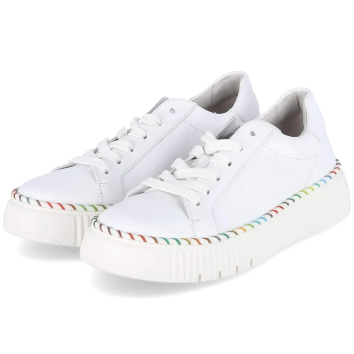Der Low Sneaker von Gabor in strahlendem Weiß verbindet zeitgemäßes Design mit durchdachtem Komfort. Die 4 cm hohe Plateausohle sorgt für sanfte Höhe und ein stabiles Laufgefühl, ihre rutschhemmende Profilierung gibt Sicherheit im Alltag. Markantes Detail ist die bunte Naht, die dem cleanen Look eine frische Note verleiht. Glattes, langlebiges Echtleder umschließt den Fuß angenehm, die runde Schuhspitze bietet ausreichend Raum. Schnürsenkel erlauben eine präzise Anpassung, während gepolsterter Einstieg, verstärkter Fersenbereich und das gepolsterte, herausnehmbare Fußbett den Tragekomfort erhöhen. Die pflegeleichte synthetische Decksohle rundet die Alltagstauglichkeit ab. Der Sneaker fällt normal aus und eignet sich als vielseitiger Begleiter für Damen. Modetipp: Zu Cropped-Jeans und einem cremefarbenen Stricktop entsteht ein minimalistischer Look, den die bunte Naht elegant akzentuiert.