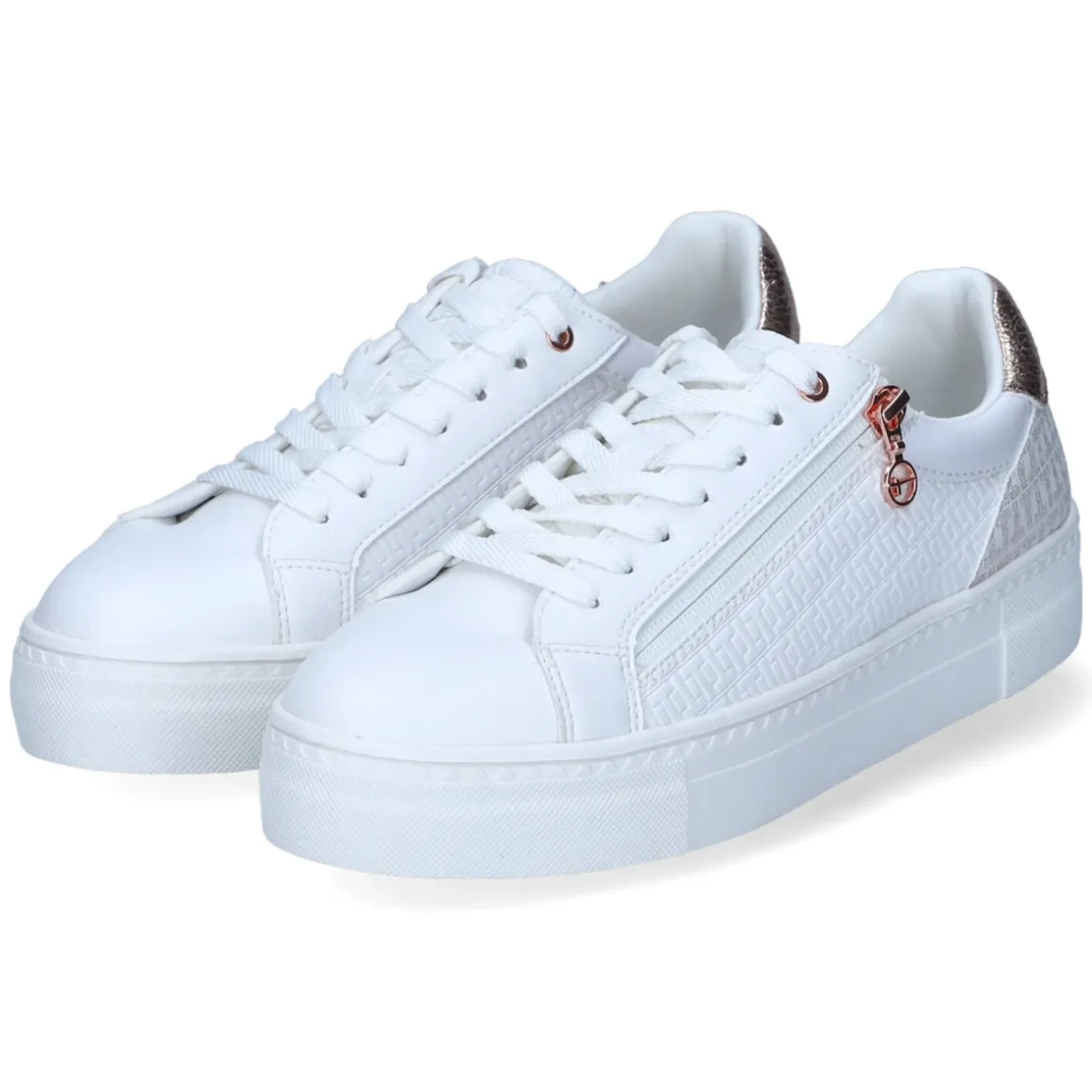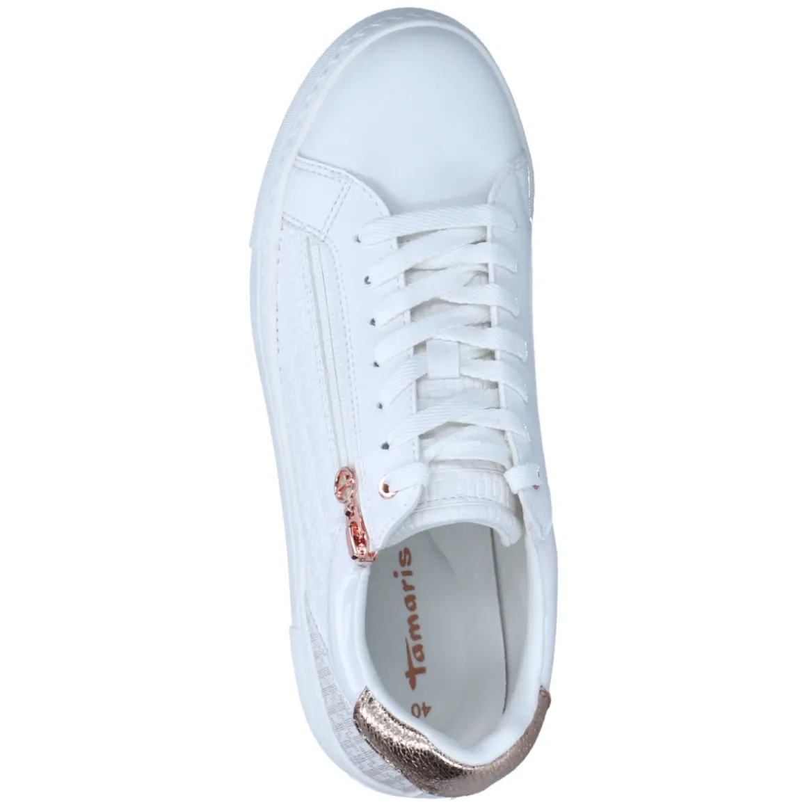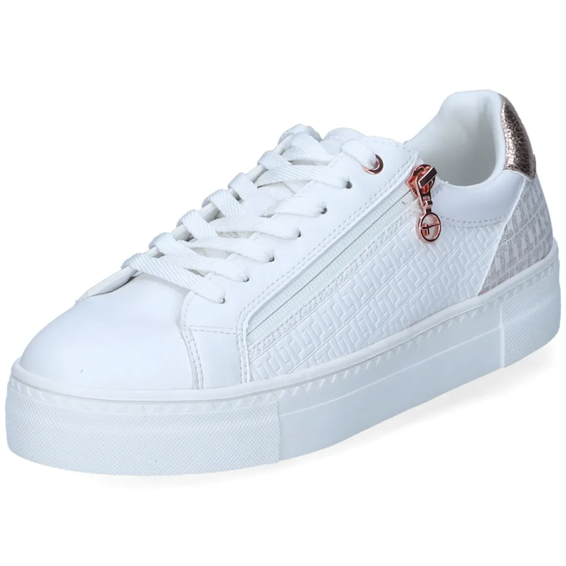 Der Low Sneaker von Tamaris zeigt sich in strahlendem Weiß mit roségoldenen Details und feiner seitlicher Prägung. Schnürsenkel plus zusätzlicher Reißverschluss ermöglichen ein schnelles Hineinschlüpfen und sichern zugleich den Sitz. Das gepolsterte Fußbett und die weiche Textildecksohle sorgen gemeinsam mit dem gepolsterten Einstieg für angenehmen Komfort, während der verstärkte Fersenbereich Stabilität bietet. Die flexible Cupsohle mit rutschhemmendem Grip und 3,5 cm Plateau verleiht dezent Höhe und urbanen Charakter. Aus veganen Materialien gefertigt und mit recyceltem Textilfutter ausgestattet, präsentiert sich das Modell umweltfreundlich und nachhaltig. Das Obermaterial aus Textil und Synthetik wirkt modern und pflegeleicht, die runde Spitze unterstreicht den zeitlosen Look. Modetipp: Besonders harmonisch zu cropped Jeans und einem fließenden Trench in Creme; für einen eleganten Twist mit roségoldenem Schmuck akzentuieren.