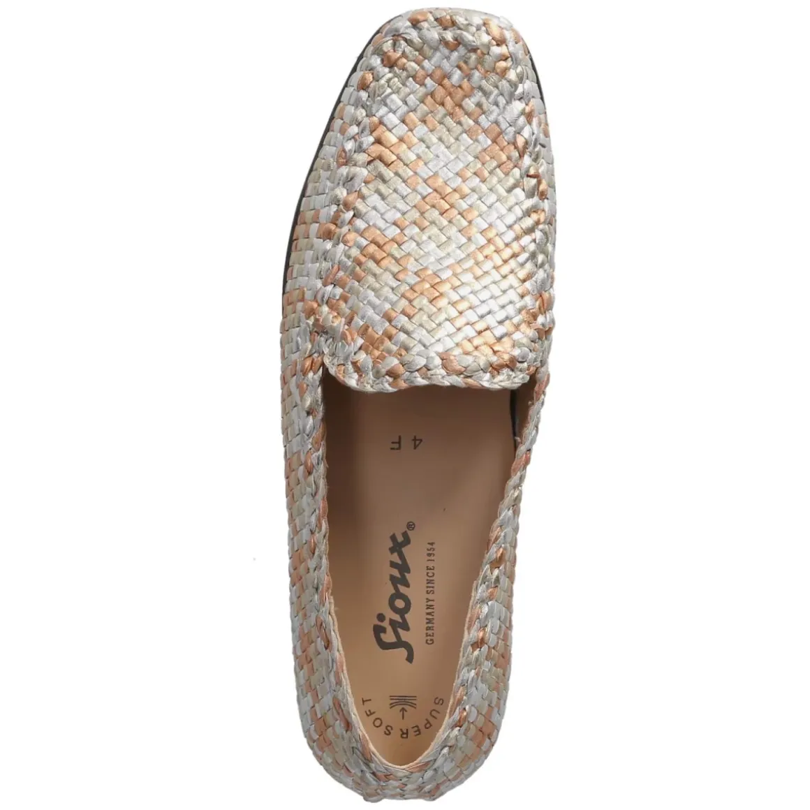 Mokassins CORDERA von Sioux verbinden festliches Design mit alltagstauglichem Komfort. Die schimmernde, geflochtene Oberfläche in Mehrfarboptik sorgt für einen eleganten Blickfang, während das Obermaterial aus hochwertigem Glattleder edel glänzt. Innen verwöhnen Lederfutter und eine gepolsterte Lederdecksohle das Fußklima und bieten weichen Auftritt. Der runde Leisten wirkt klassisch, der stabile Blockabsatz von 1,5 cm gibt dezenten Lift. Dank Schlupfform gelingt das Anziehen mühelos, die flexible, rutschhemmende Laufsohle gibt sicheren Halt. Der Schnitt fällt größengetreu aus und macht das Modell zur zuverlässigen Wahl für besondere Anlässe wie auch gepflegte Daily-Looks. Modetipp: Zu einer knöchellangen Zigarettenhose und einer fließenden Seidenbluse kommt der mehrfarbige Schimmer besonders zur Geltung – eine Metallic-Clutch greift das Spiel der Farben stilvoll auf.